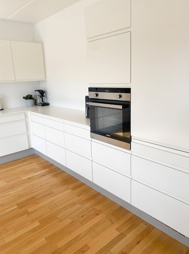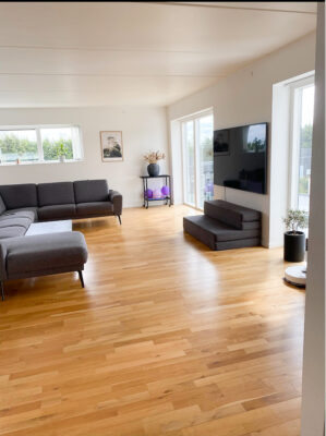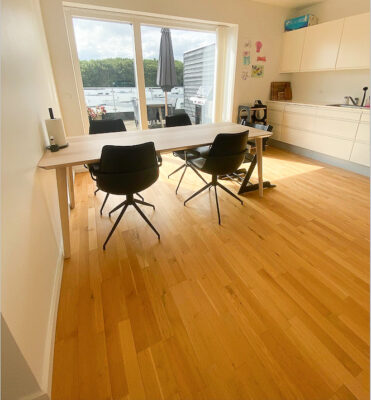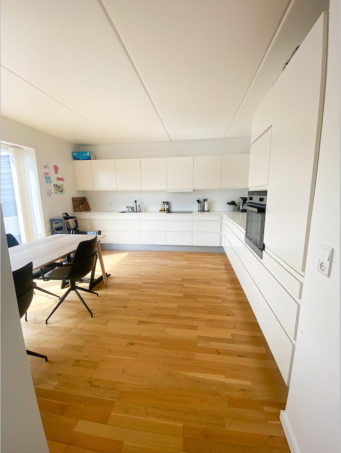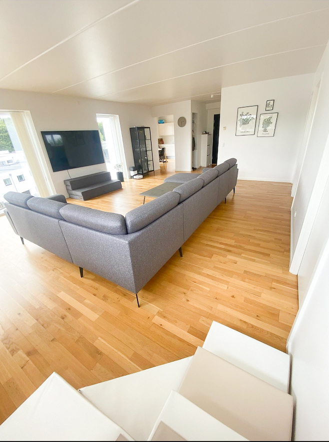 Der venter jer et vedligeholdelsesfrit hjem, der er lige til at flytte ind i. Fra badeværelset breder sig gulvvarme overalt, og lyset strømmer ind af de store vinduespartier. I stuen opleves dette særligt fra den brede glasskydedør, som endvidere sætter jer i forbindelse med den den store terrasse. Stuen har en spændende opbygning med et lækkert køkken i forlængelse. Sidstnævnte har elementer fra HTH og direkte udgang til tagterrassen.