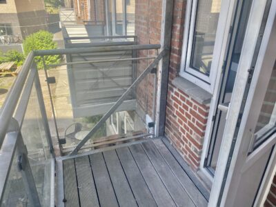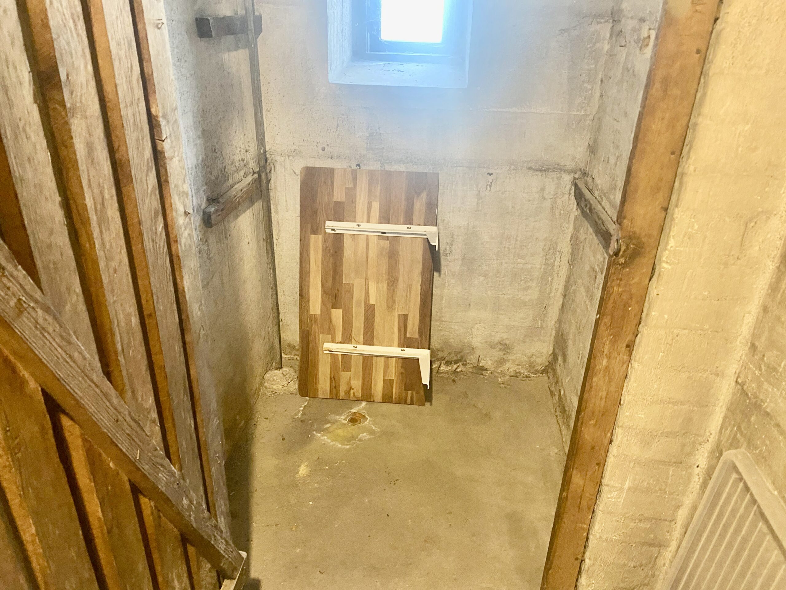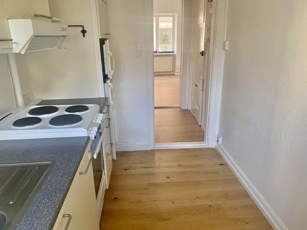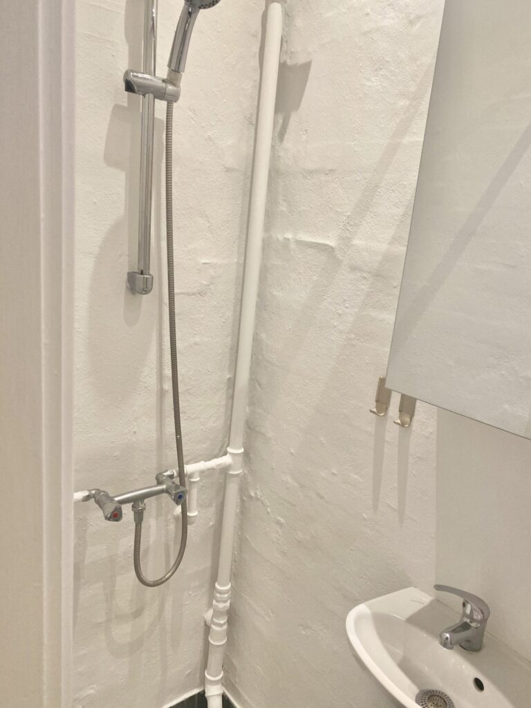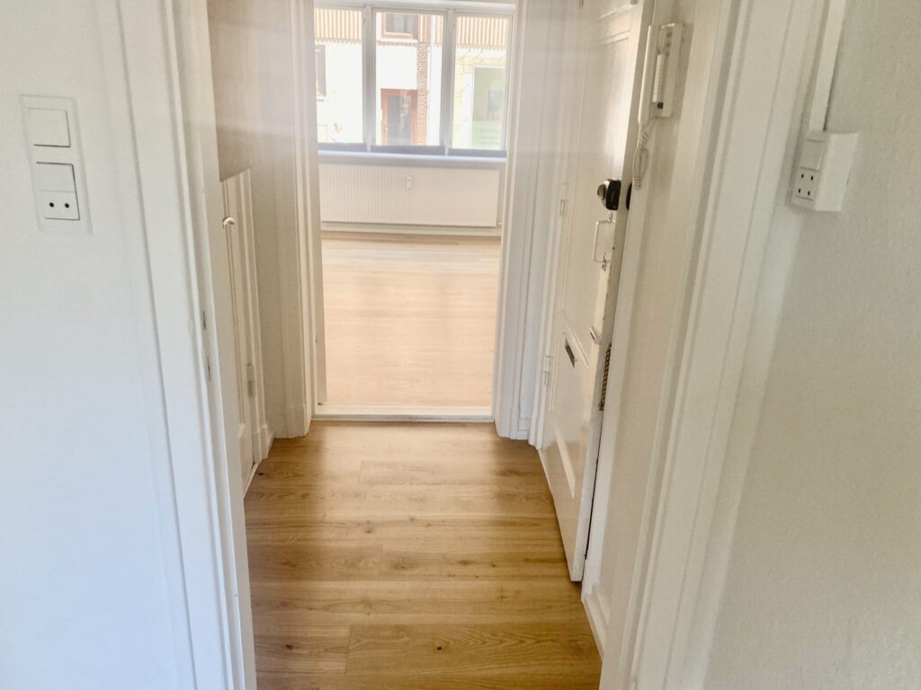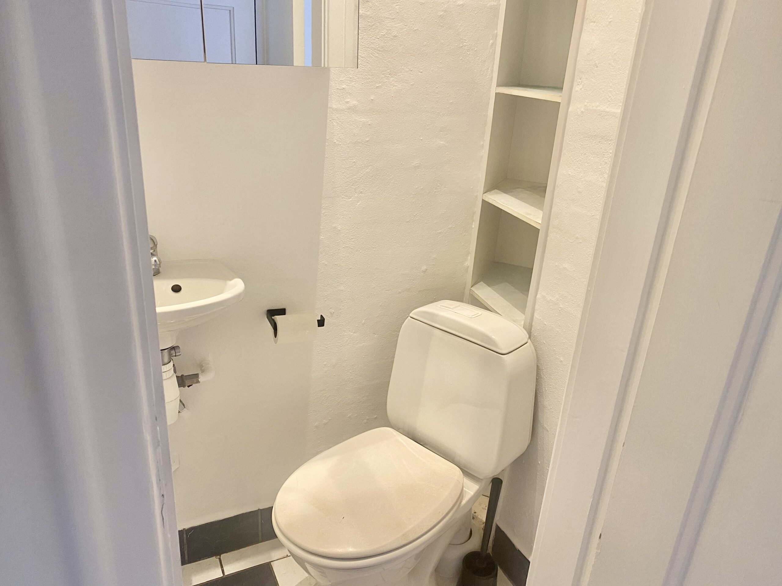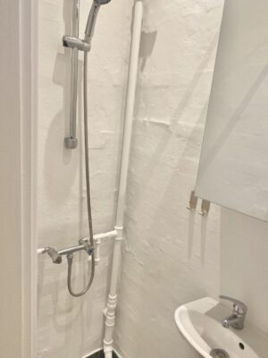 Lejligheden er super fin med en lille entré, der først fører ud til badeværelset. Det er en smule opdelt med toilet i den ene side, håndvask i midten og bruser i den anden side. Der kan derfor sættes en stang op til bruseforhæng, som adskiller bruseren fra resten.