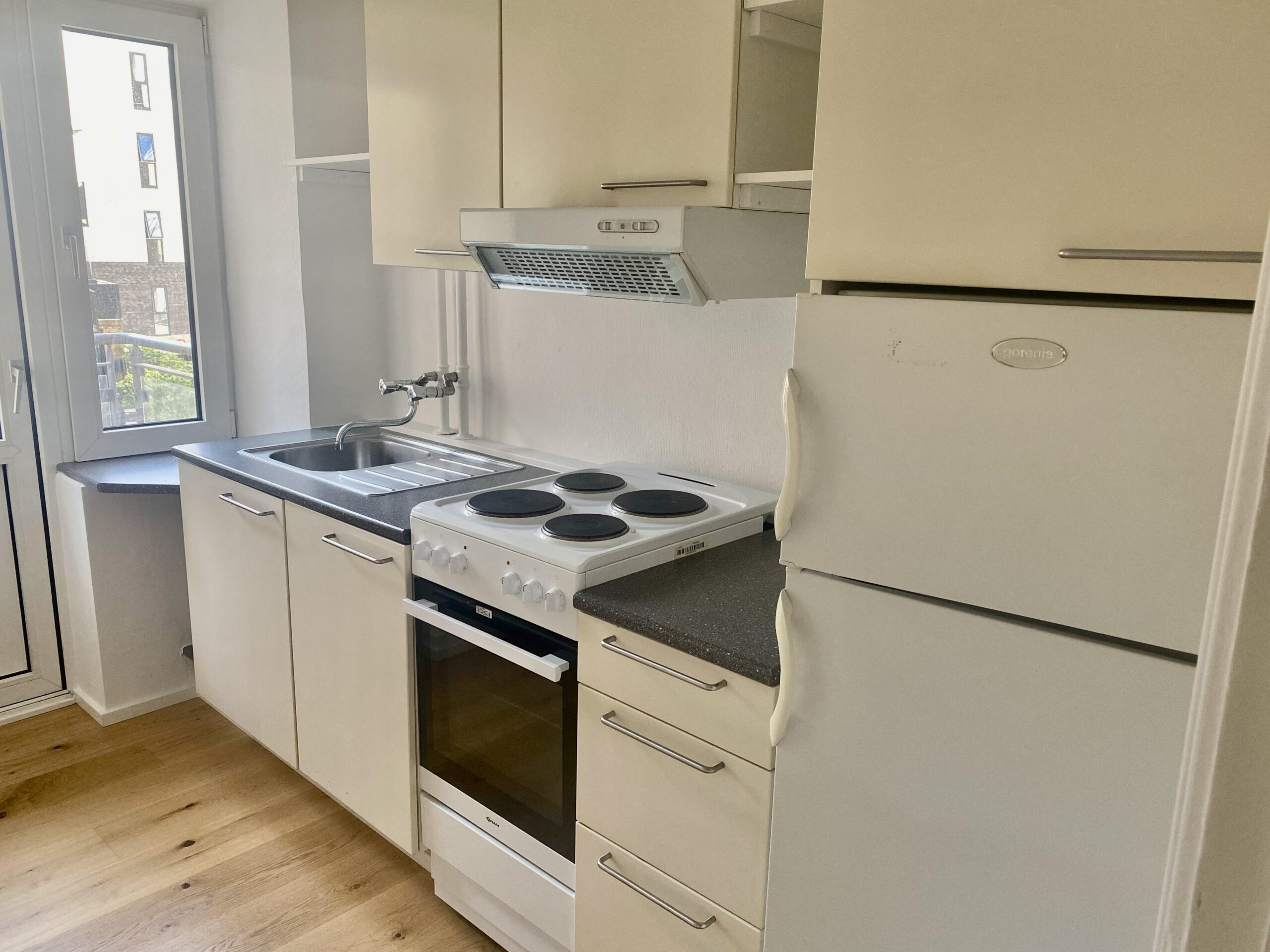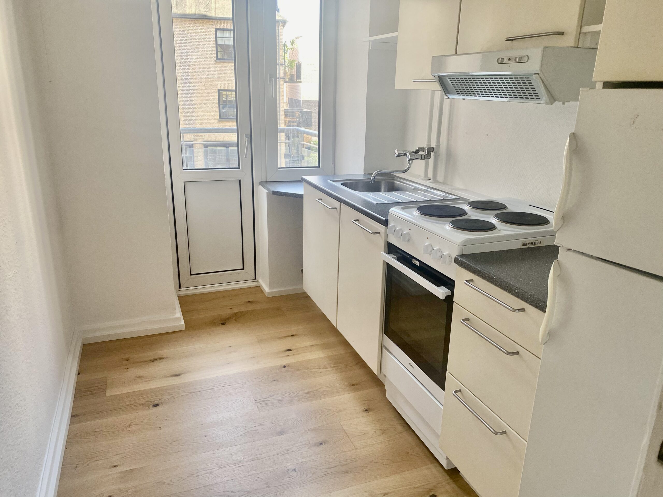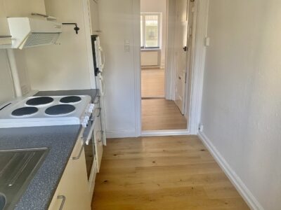 Til venstre side for indgangen har vi køkkenet. Det er pænt hvidt og har plads til et mindre spisebord og to stole eller noget mere bordplads hvis man vil i modsatte side. Fra køkkenet er der adgang til egen altan, som også er forholdvis ny.