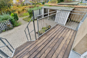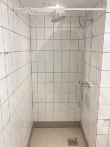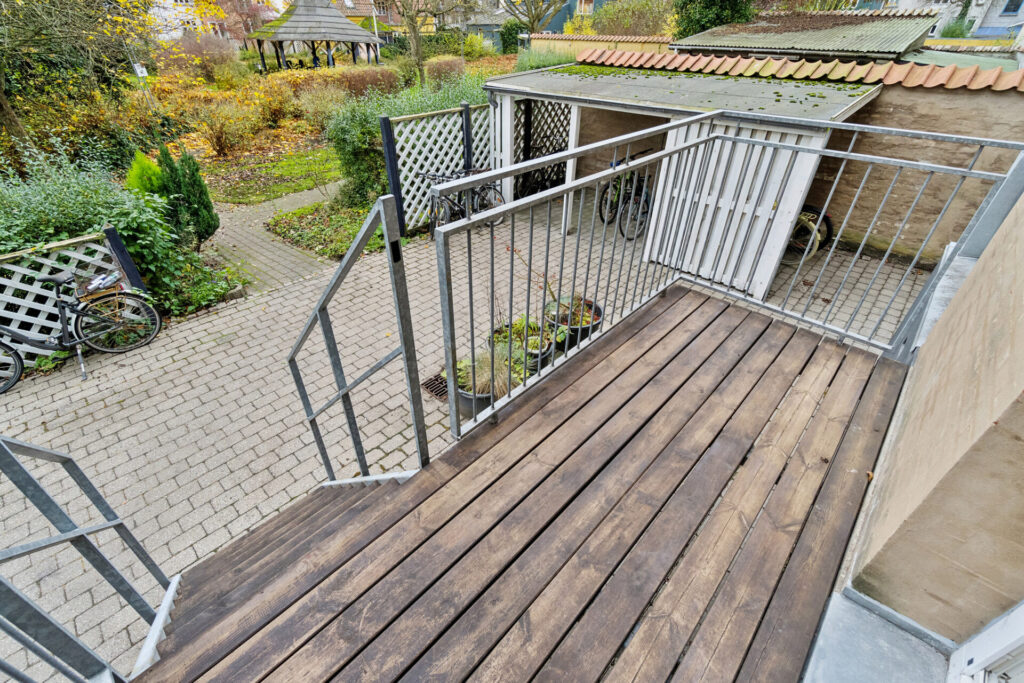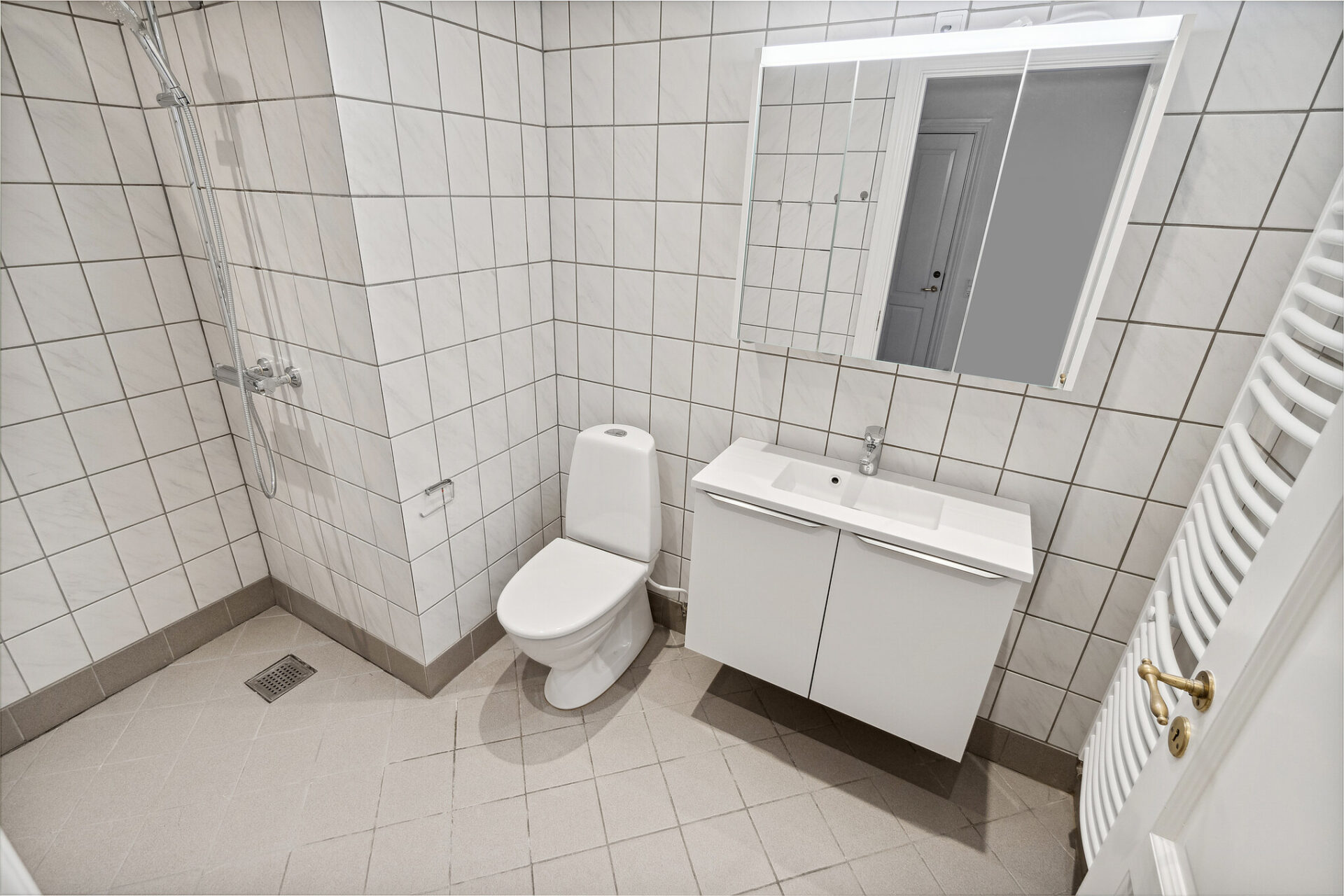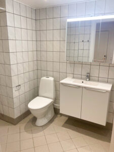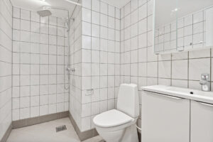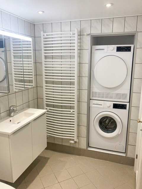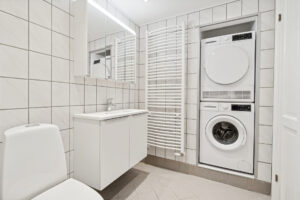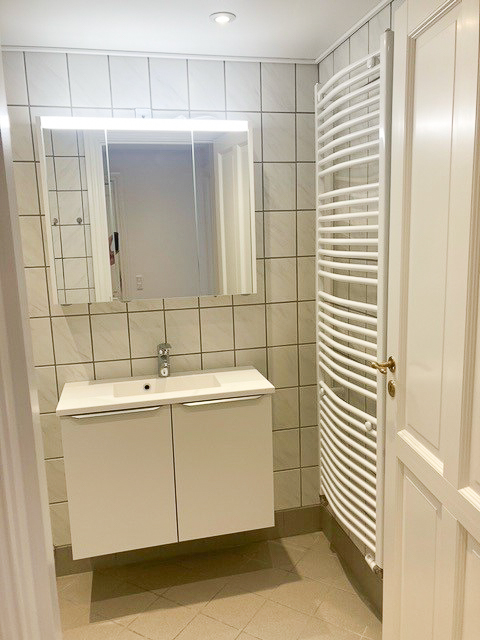 Badeværelset er ligeledes nyrenoveret og tilbyder nyt badinventar samt et praktisk spejlskab. Her finder du også gulvvarme, som sikrer en behagelig temperatur på de kolde dage. For din bekvemmelighed er der installeret vaskemaskine og tørretumbler, så du nemt kan klare dit vasketøj hjemme.