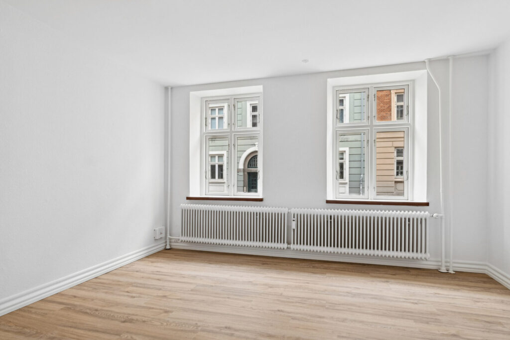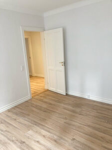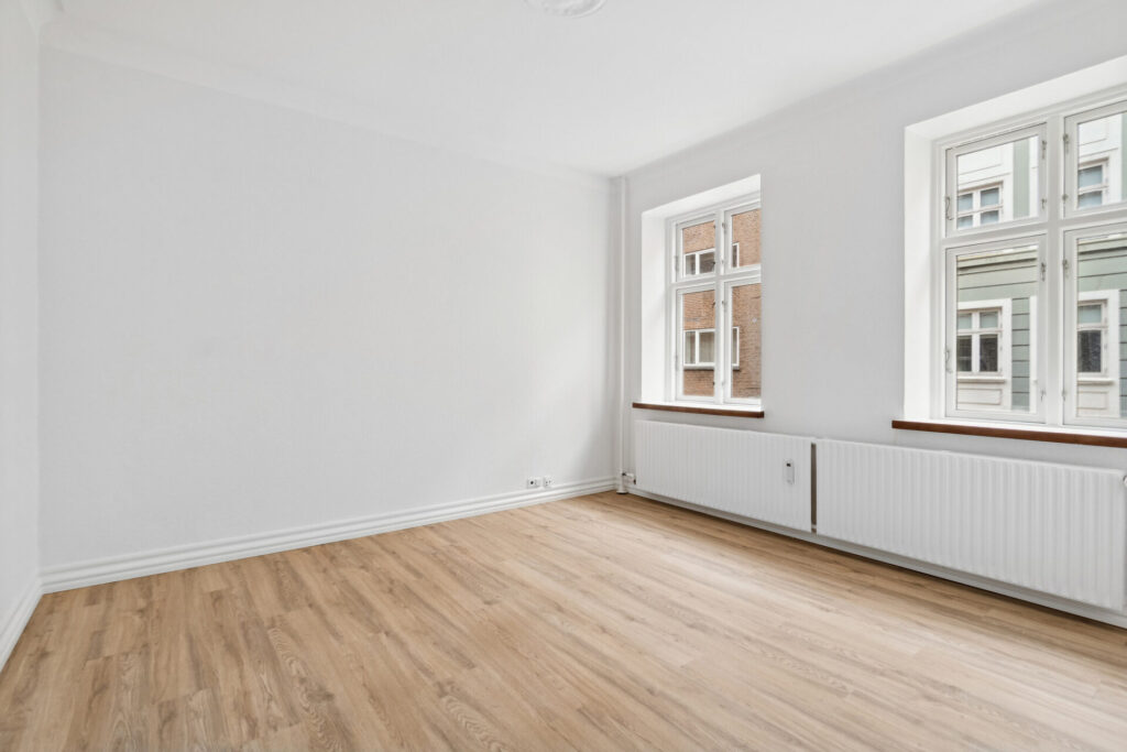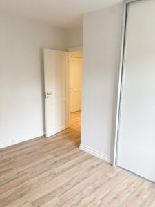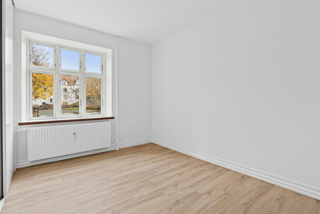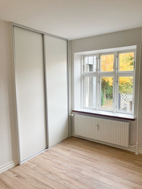 Lejlighedens soveværelse har fået et stilrent garderobeskab med skydelåger, hvilket giver god plads til opbevaring. Der er desuden nye LVT-gulve i køkken, stue, soveværelse og entré, der tilføjer et moderne præg til indretningen.