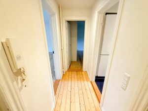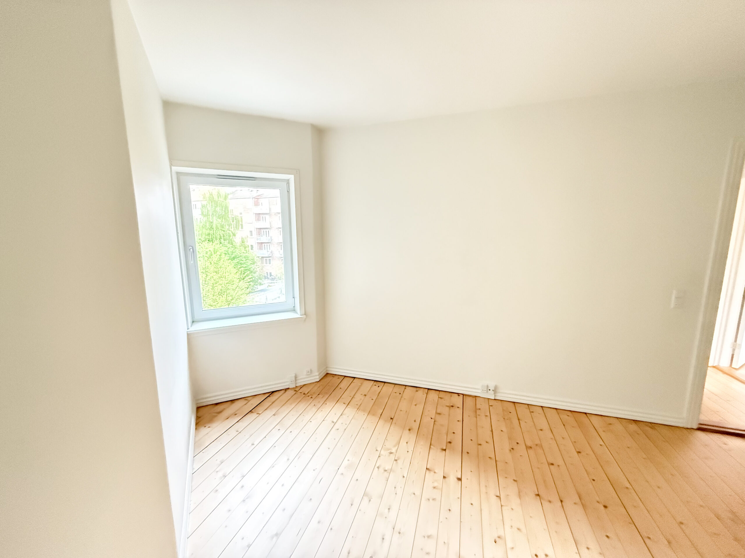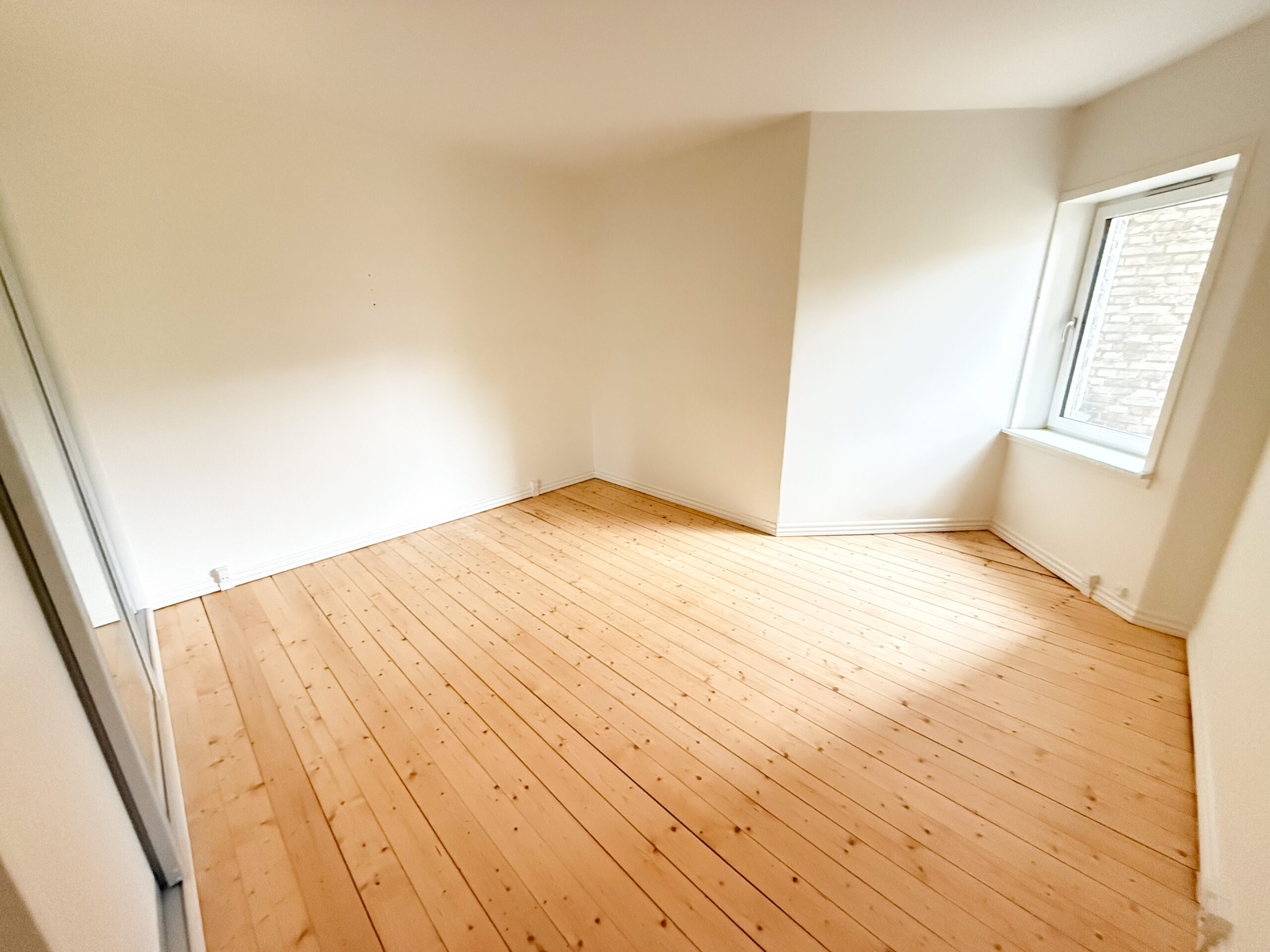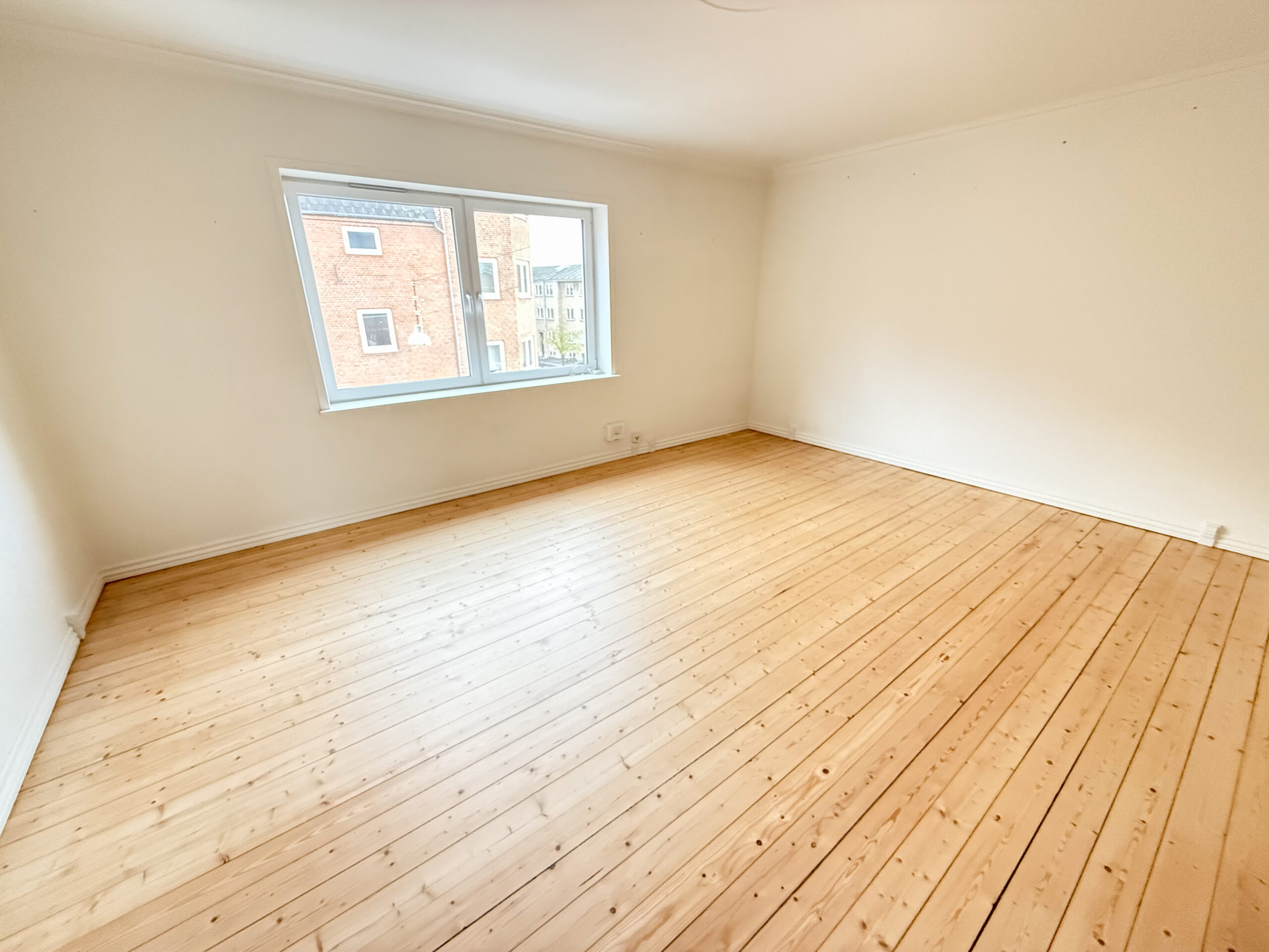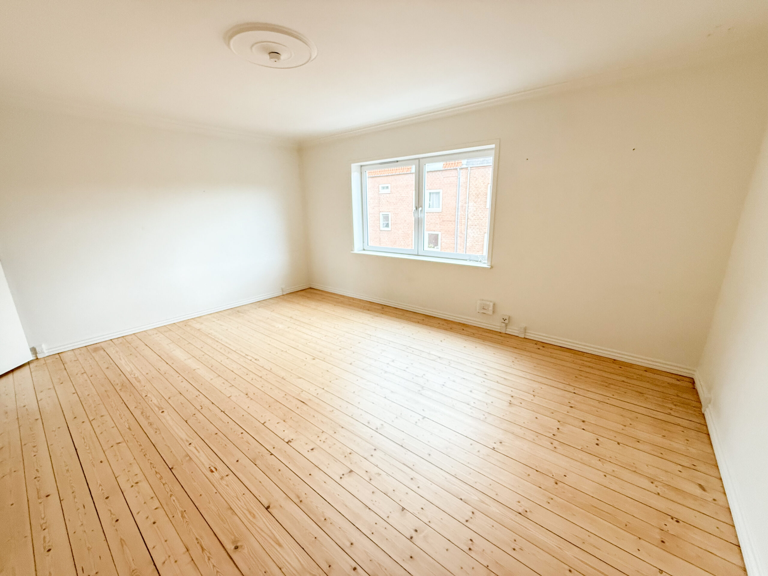 Boligen byder på en praktisk fordelingsgang med indbyggede spots, der skaber en behagelig velkomst og giver adgang til lejlighedens øvrige rum. Den store, lyse stue imponerer med smukke plankegulve og nyere vinduer, som sikrer et fantastisk lysindfald hele dagen.