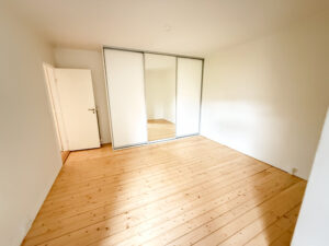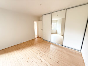Soveværelset er rummeligt og funktionelt indrettet med god plads til både seng og opbevaring i det store faste skab.