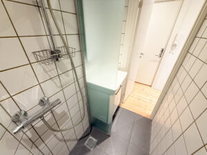 Badeværelset er stilfuldt og velindrettet med en moderne bruseniche afskærmet med glasvæg, hvilket giver et rent og elegant udtryk.