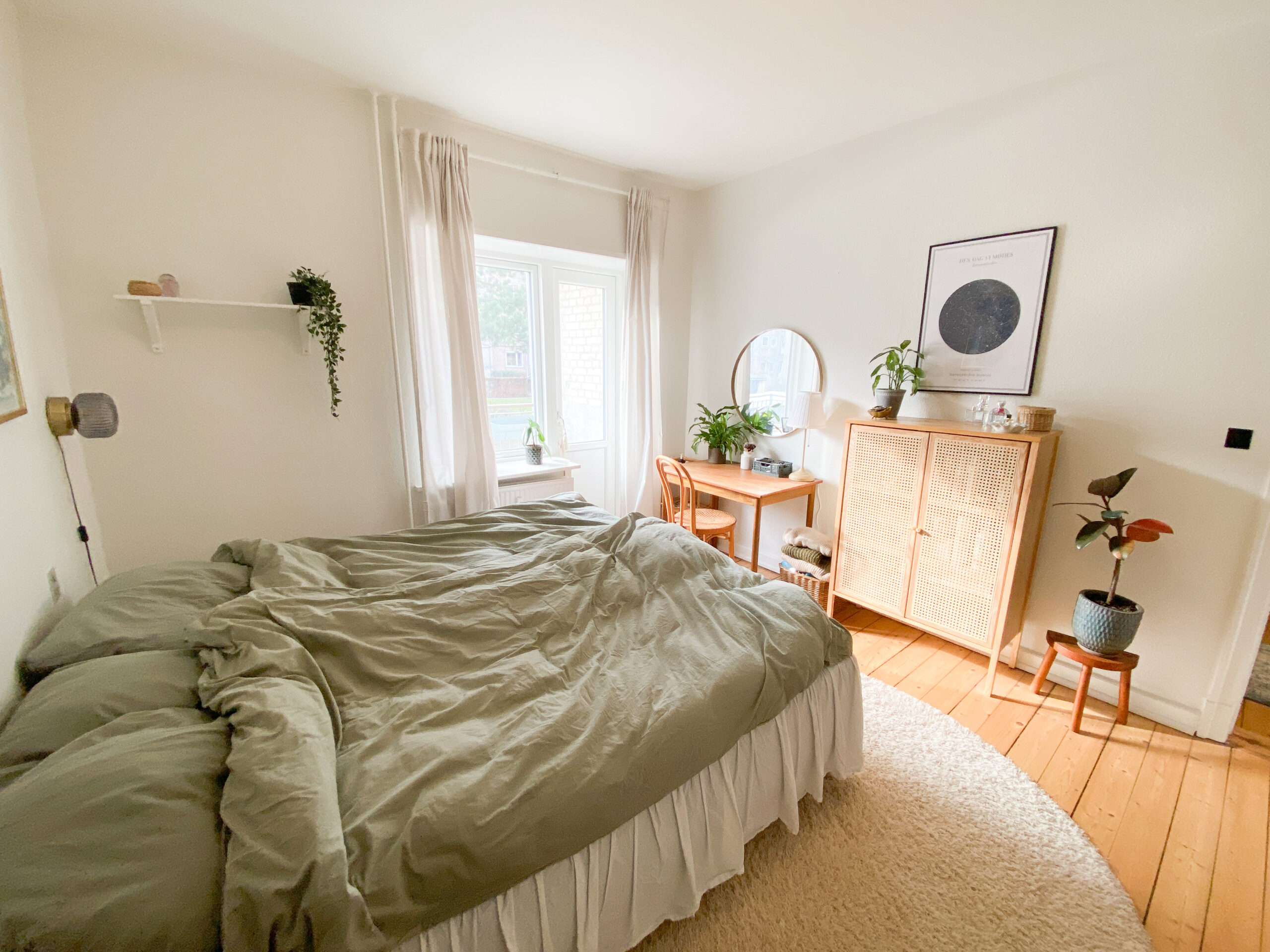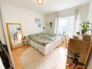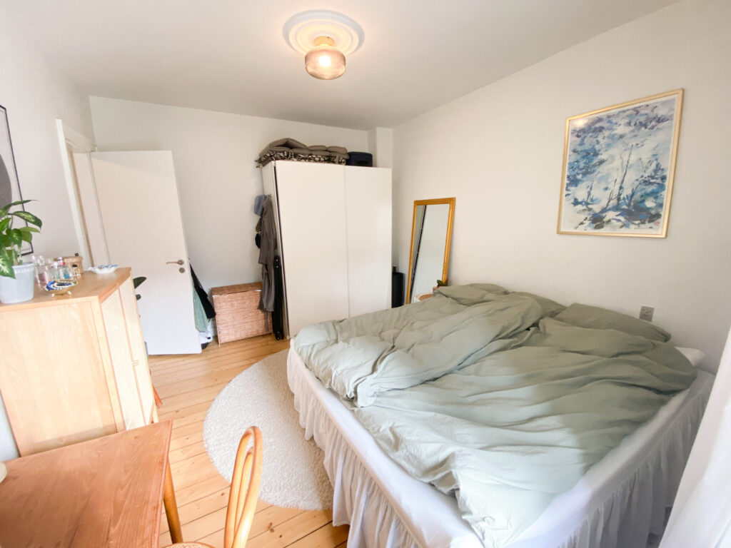 Til slut har vi soveværelset. Her er også god plads til et stort klædeskab, en almindelig dobbeltseng samt mere. Fra soveværelset er der udgang til en altan. Fra altanen er der udsigt til gårdhaven.