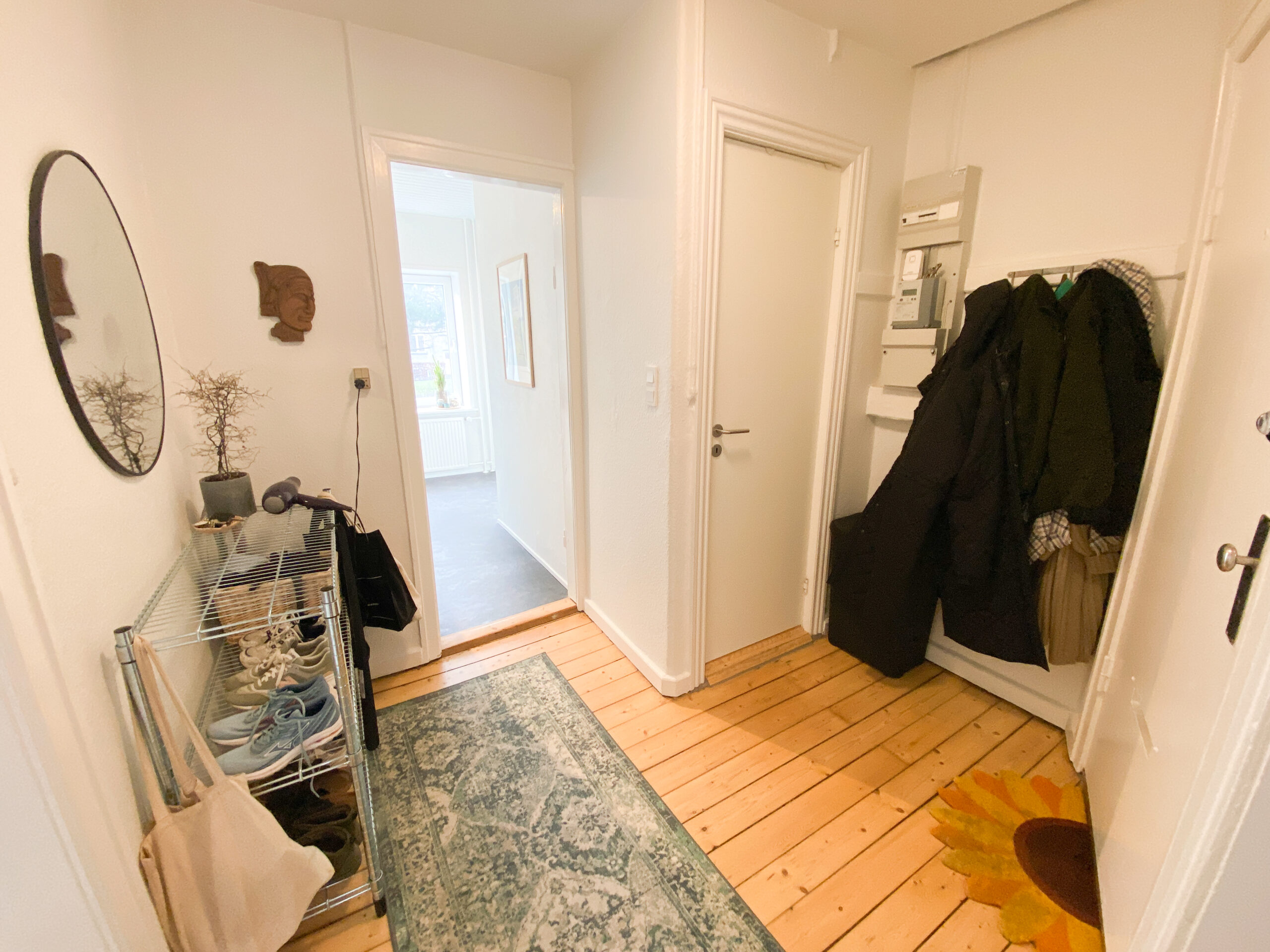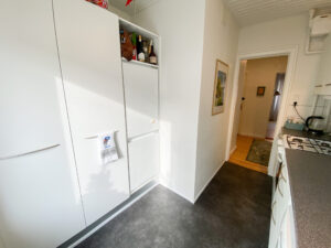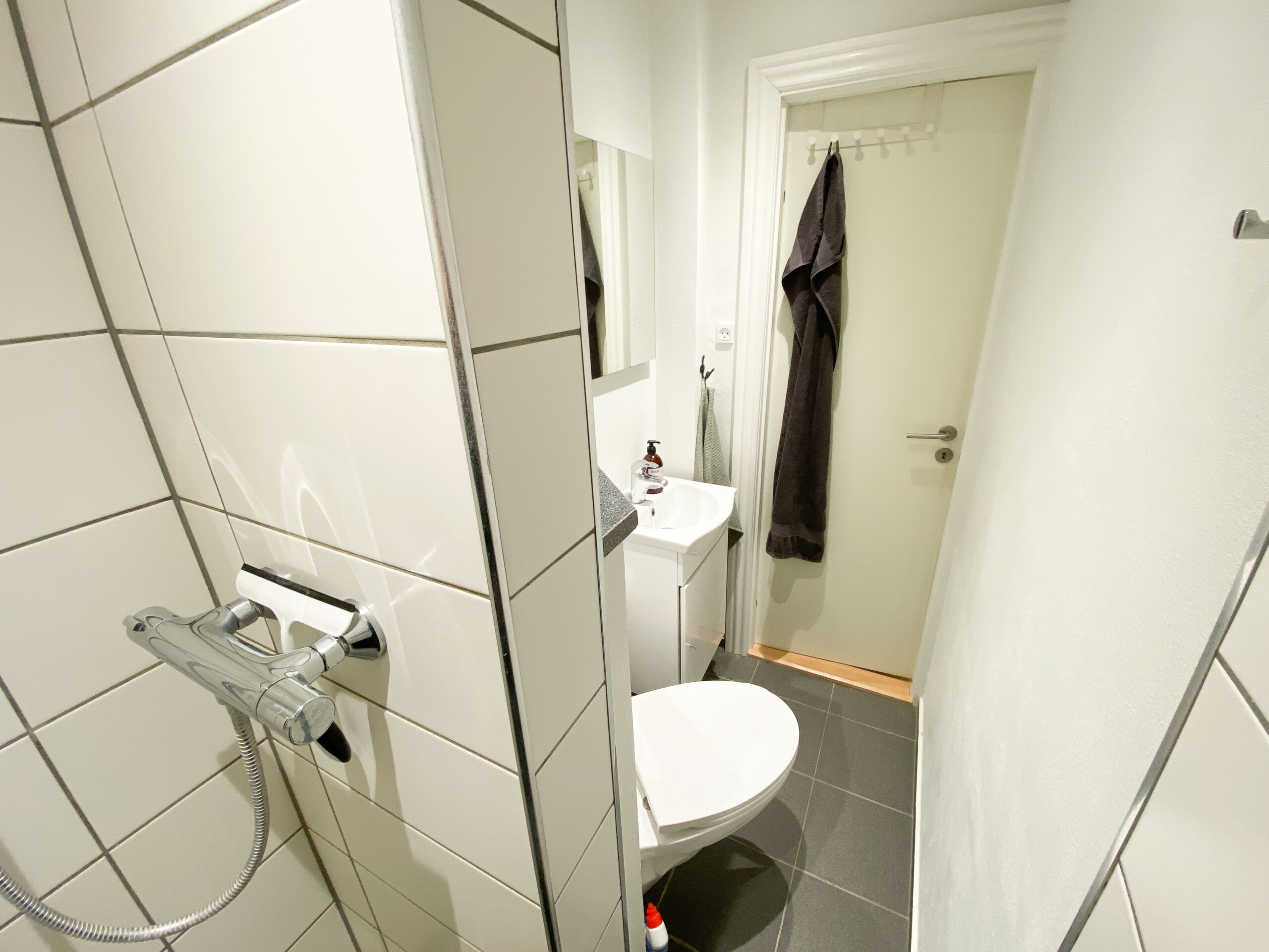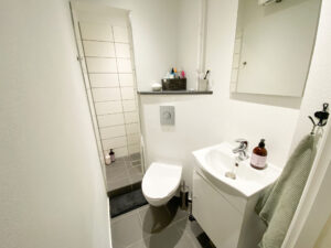 Når du træder ind i lejligheden har du en god entré, hvor der er masser af plads til overtøj m.m. Entreen er også en fordelingsgang og er midten af lejligheden. Fra entreen har du adgang til badeværelset, som det første. Her er lavet et nyt badeværelse med indbygget bruseniche, og til trods for badeværelsets lille størrelse, så føler man sig ikke for sammenklemt derude.