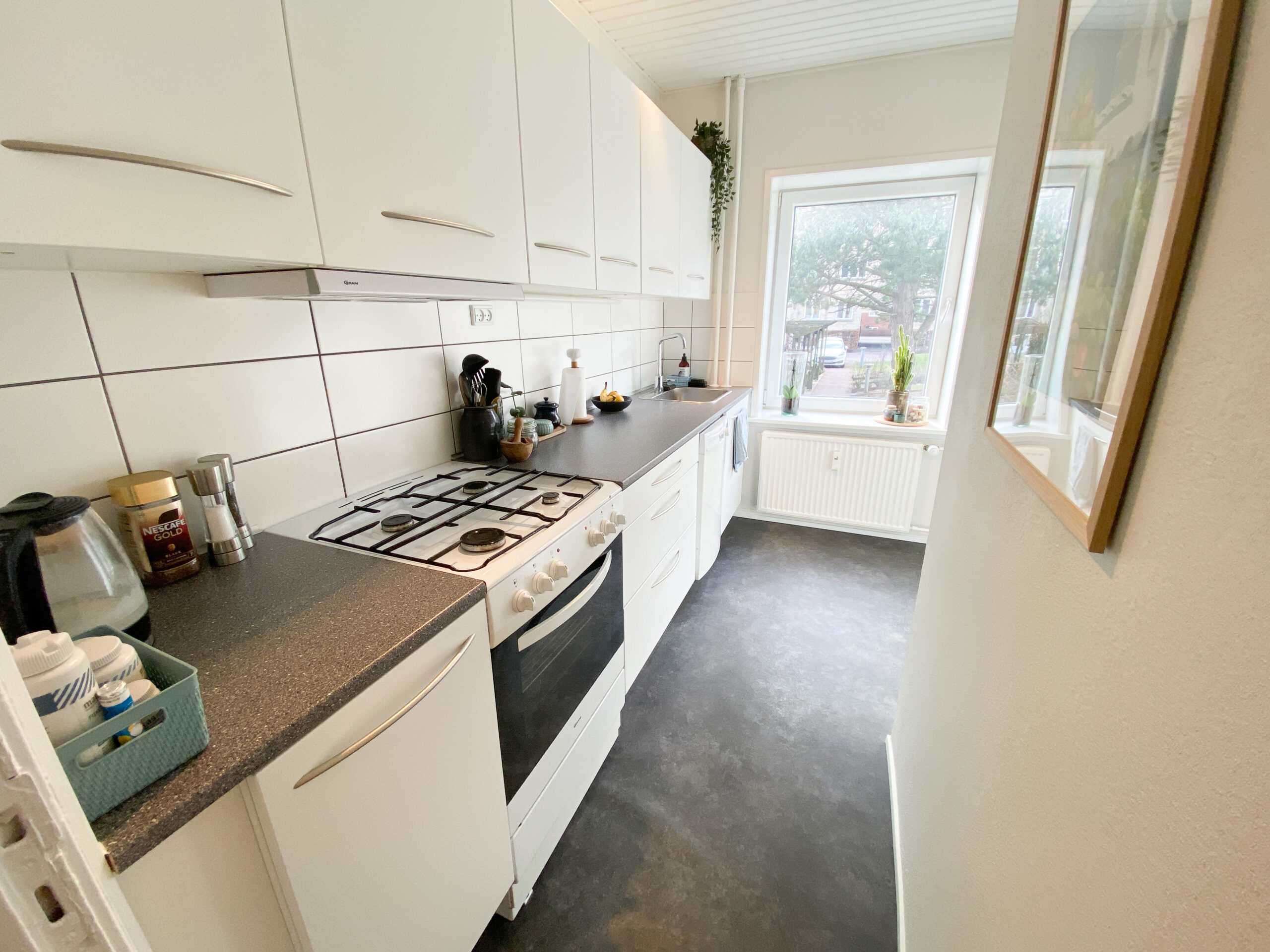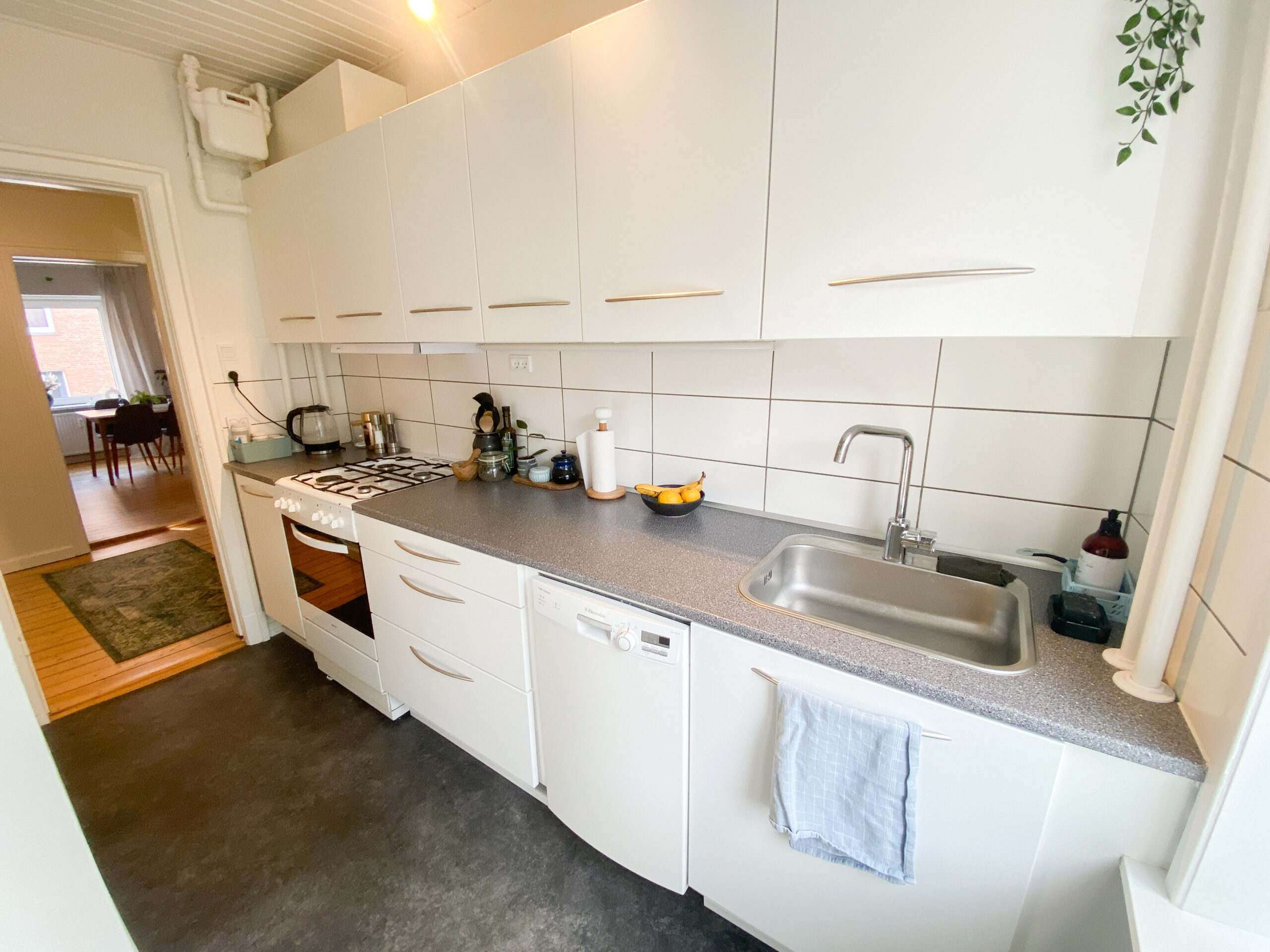 Herefter har vi køkkenet. Det er også nyt og i hvide flotte elementer. Der er installeret en opvaskemaskine og man har udsigt til den skønne gårdhave. Man kan sagtens have noget mere bordplads på modsatte side, eller eventuelt en lille bord og to stole.