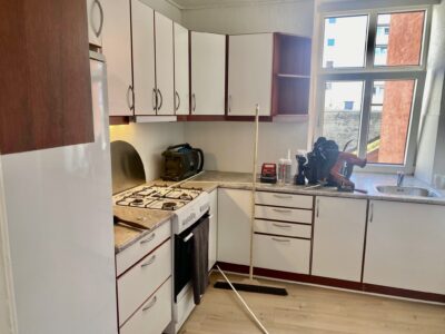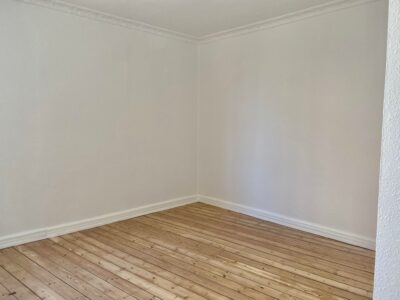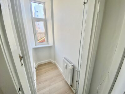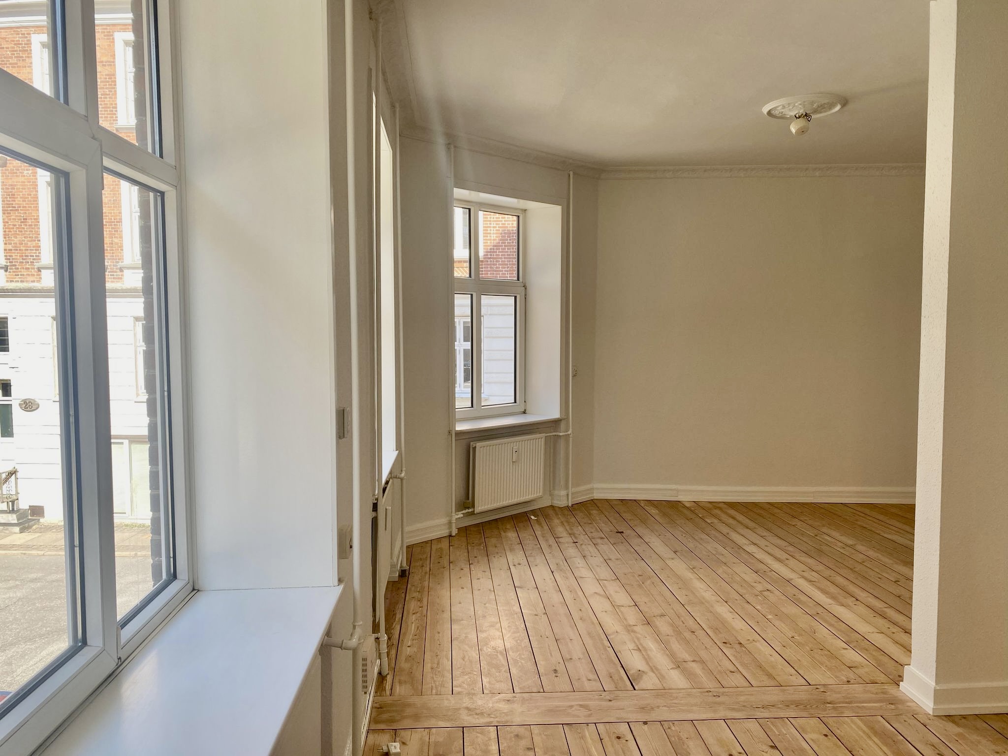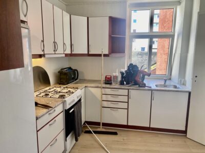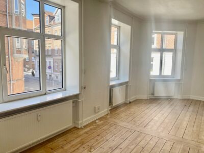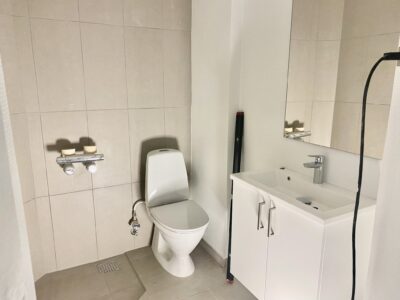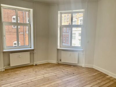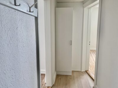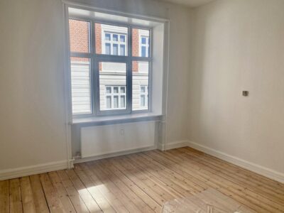 Den er nyrenoveret med nyt badeværelse. Lejligheden er bestående af en entré, hvor du som det første kan gå ud på badeværelset. Det er i flotte lyse farver. Dernæst kan man gå ud i køkkenet som er ret stort, så der er godt med bordplads og det er i en fin rødbrun farve. Mellem bagtrappen og køkkenet er der en mellemgang med et lille depotrum.