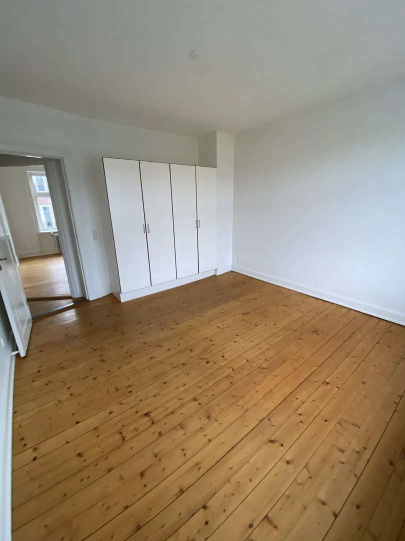 Lejligheden byder på 80 m2 fordelt på tre gode rum, der alle prydes af afhøvlede og oliebehandlede plankegulve, hvidmalede vægge og behagelige loftshøjder. Entréen, der har linoleumsbelægning, fungerer som en praktisk fordelingsgang til boligens øvrige rum. Opholdsrummene er lyse og indbydende med store vinduespartier og originale fyldningsdøre. Her er god plads til både spise- og sofazone, og det fleksible rum kan tilpasses som stue, soveværelse eller hjemmekontor. Soveværelset har desuden et rummeligt garderobeskab, der gør opbevaring let.