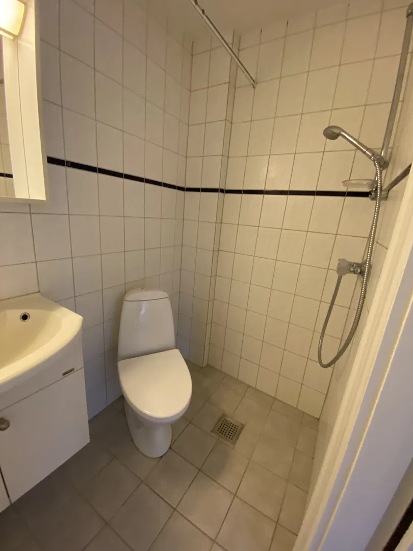 Køkkenet er praktisk indrettet med hvide elementer og massive træforkanter, hvilket giver en varm og indbydende følelse. Det er udstyret med alle nødvendige hvidevarer, herunder komfur, emhætte, køle-/fryseskab og opvaskemaskine. Badeværelset er funktionelt med fliser i bruseområdet og et enkelt skabsarrangement med vask.