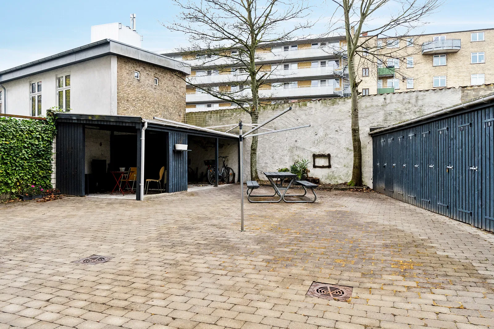 I kælderen findes et fælles vaskeri, og det brolagte gårdmiljø indbyder til ophold med borde og bænke samt tørremuligheder og cykelparkering. Her kan man nyde en stille stund i læ fra gaden. Husdyrhold er ikke tilladt.