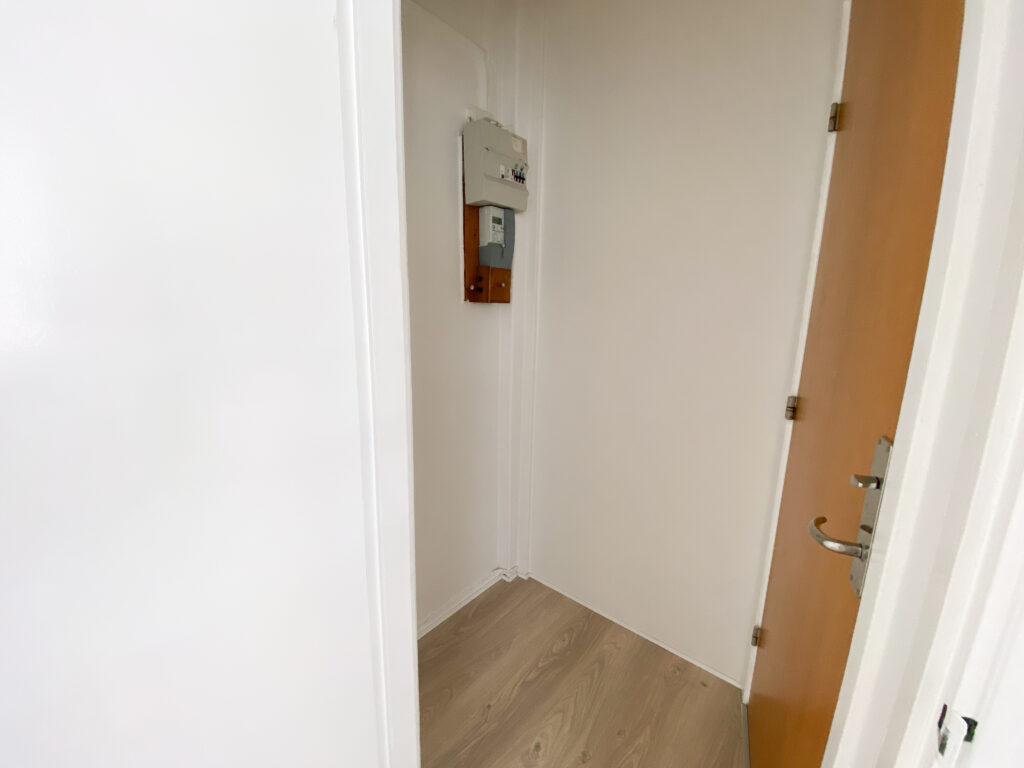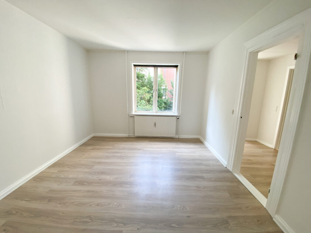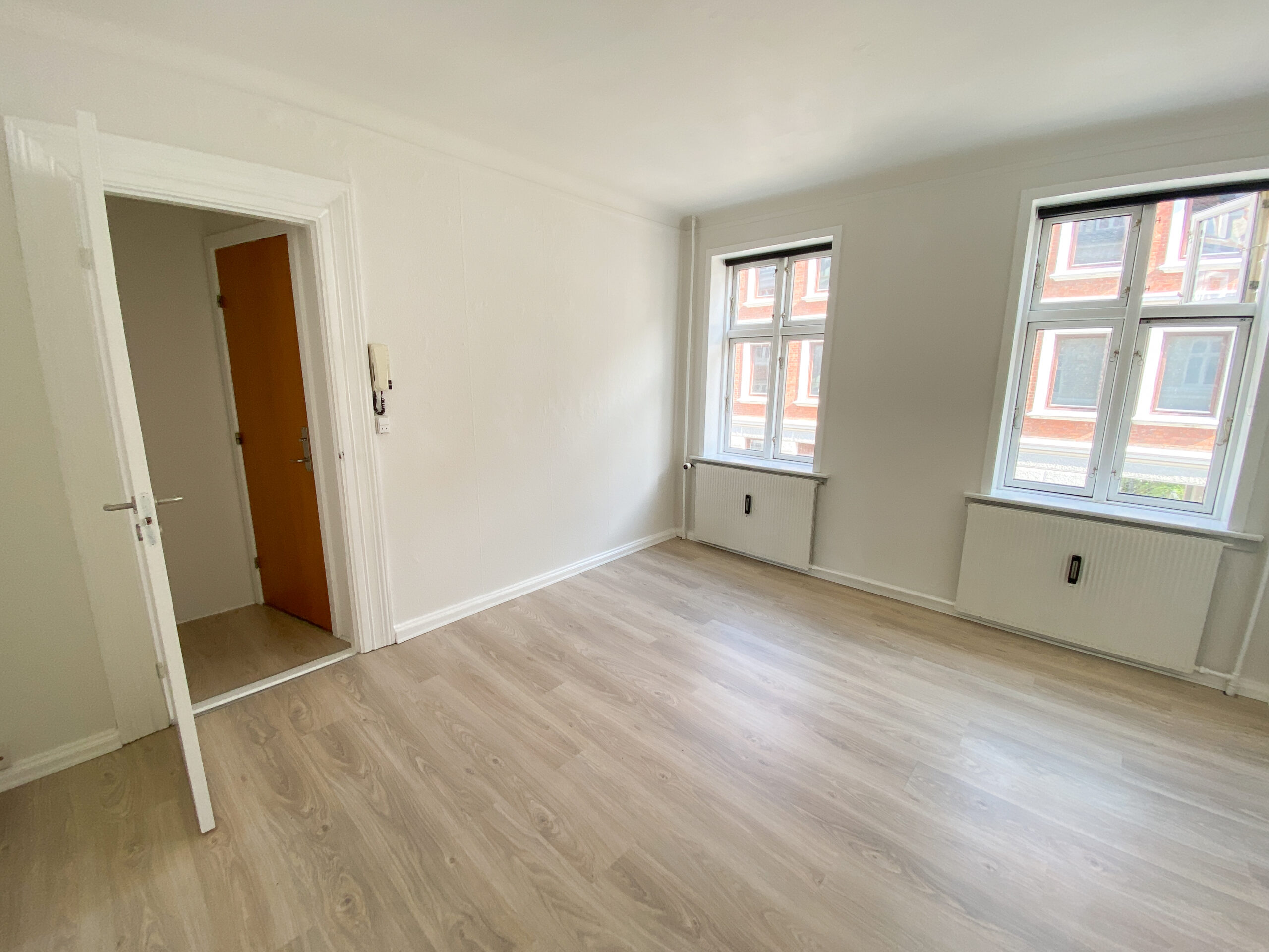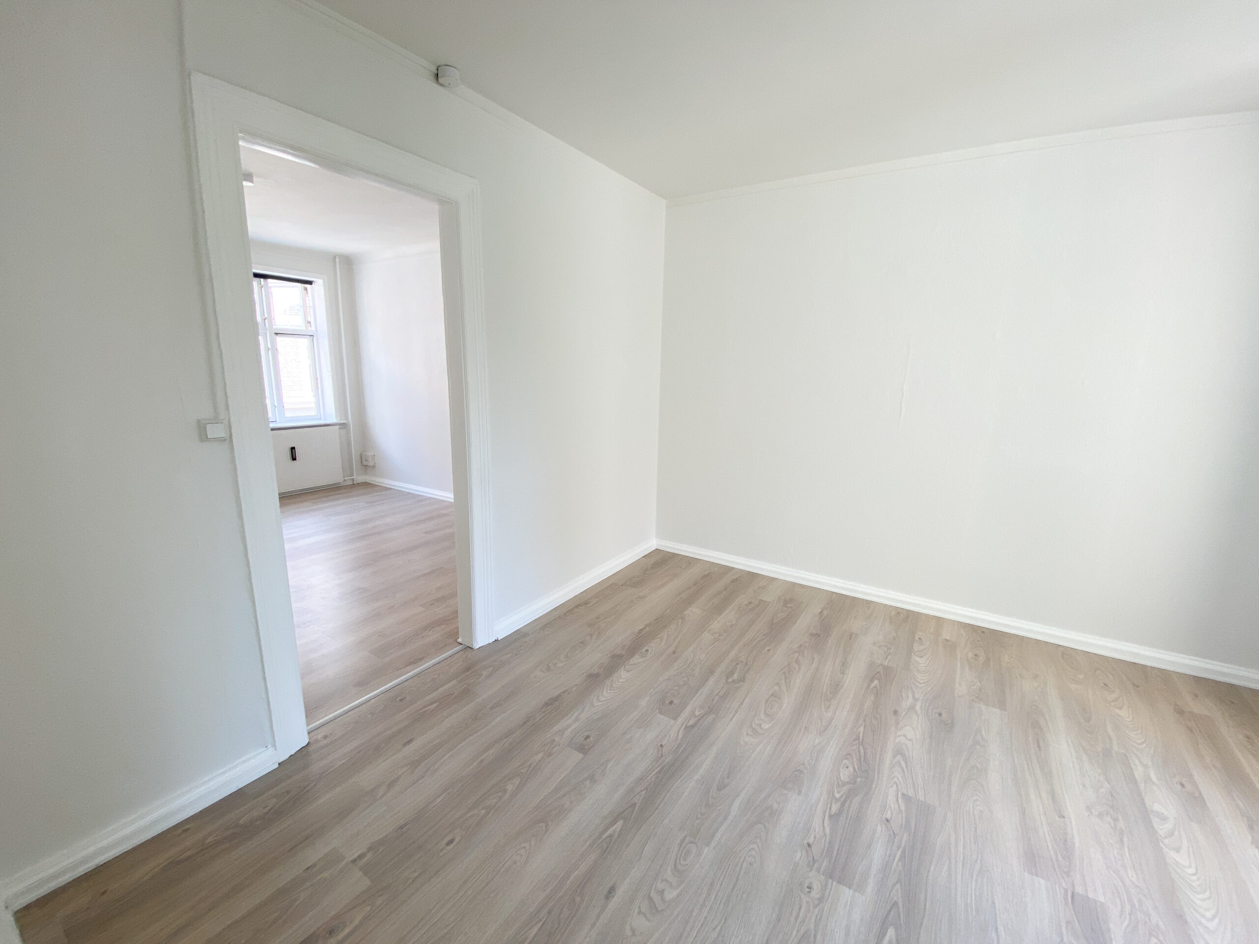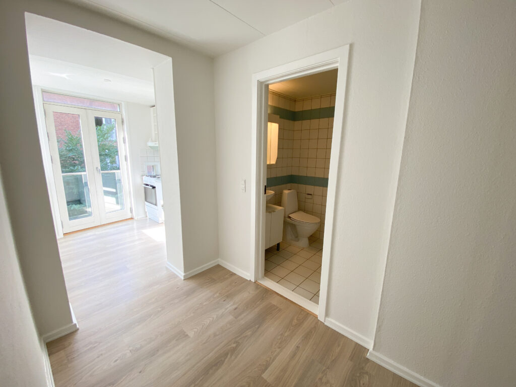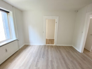 Lejligheden indledes med en lille entré, hvorfra der er adgang til den første af to sammenhængende stuerum. Det første rum egner sig perfekt som opholdsstue, og herfra føres du videre ind i et tilstødende værelse, der eksempelvis kan anvendes som soveværelse. De to rum ligger i direkte forbindelse og skaber en god rumfornemmelse og fleksible indretningsmuligheder.