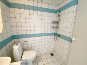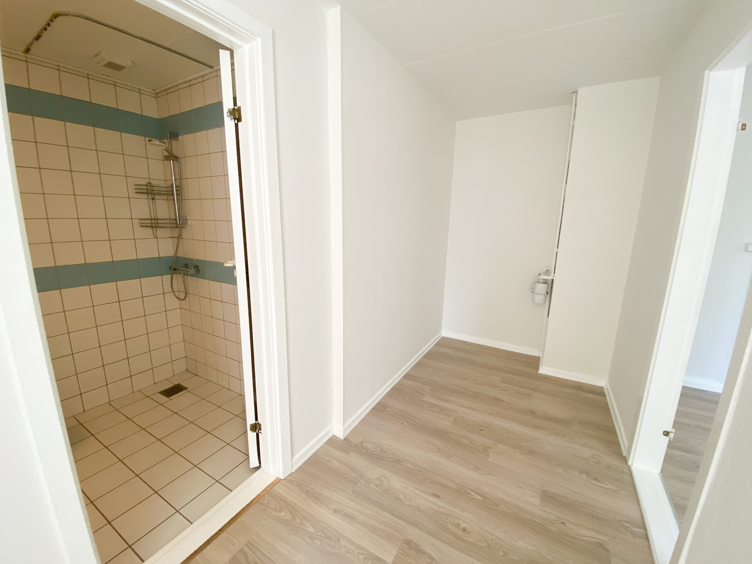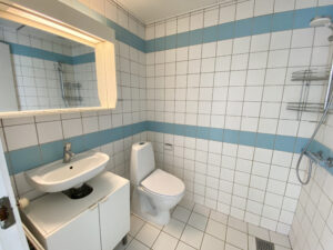 I mellemgangen er der ligeledes adgang til et pænt og lyst badeværelse med hvide klinker og et separat brusehjørne.