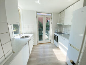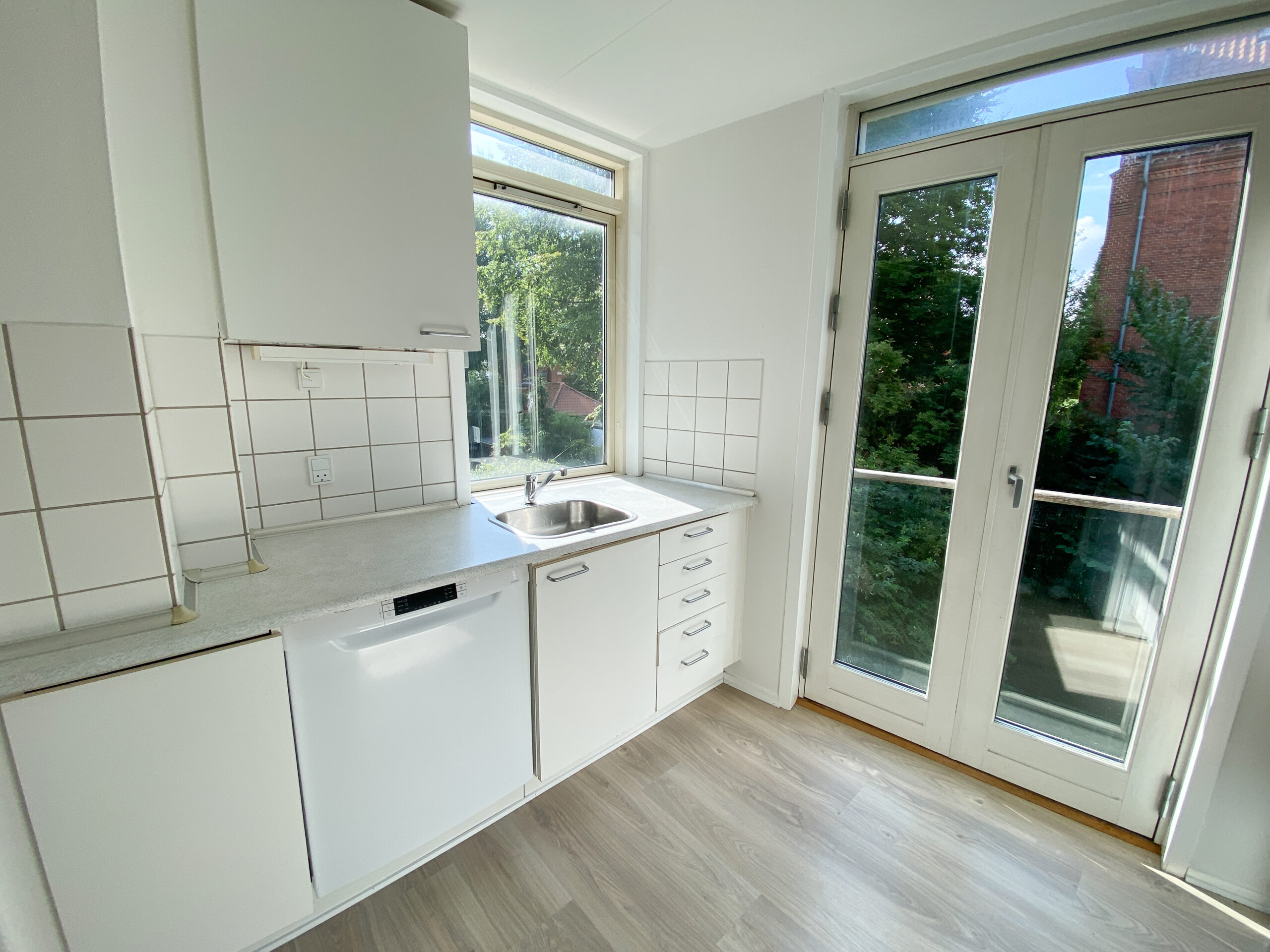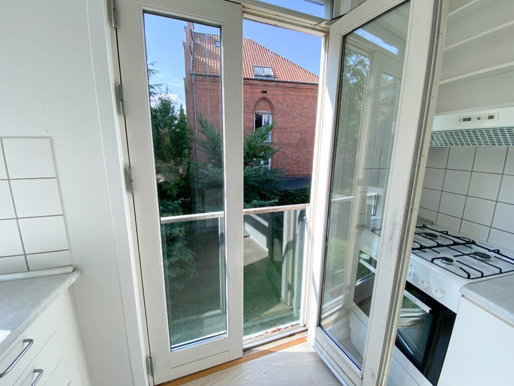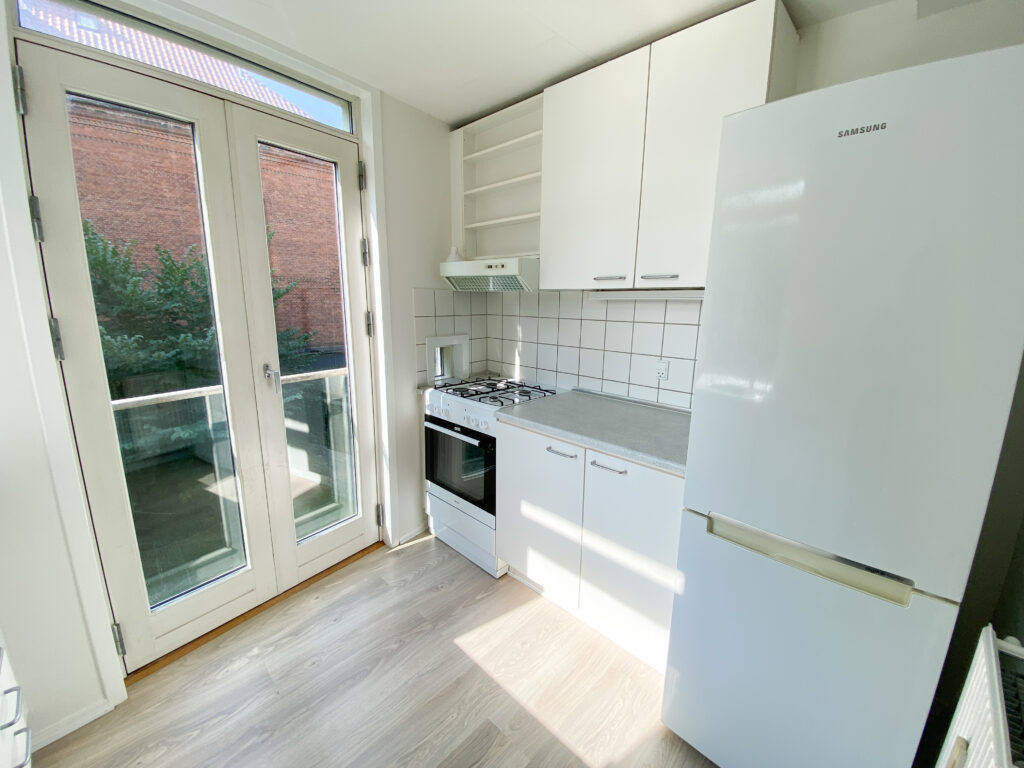 Fra værelset træder du ud i en mellemgang, som kan udnyttes optimalt til en lille arbejdsplads eller en spiseplads. I den ene ende af gangen finder du lejlighedens køkken, der er indrettet med køkkenelementer på begge sider og afsluttes af en skøn fransk altan, som giver et dejligt lysindfald. Køkkenet er funktionelt og indeholder blandt andet en opvaskemaskine.