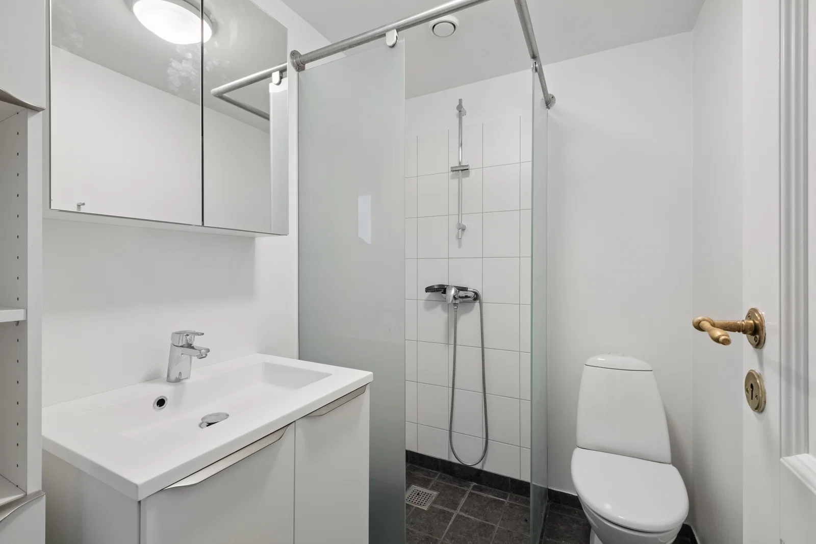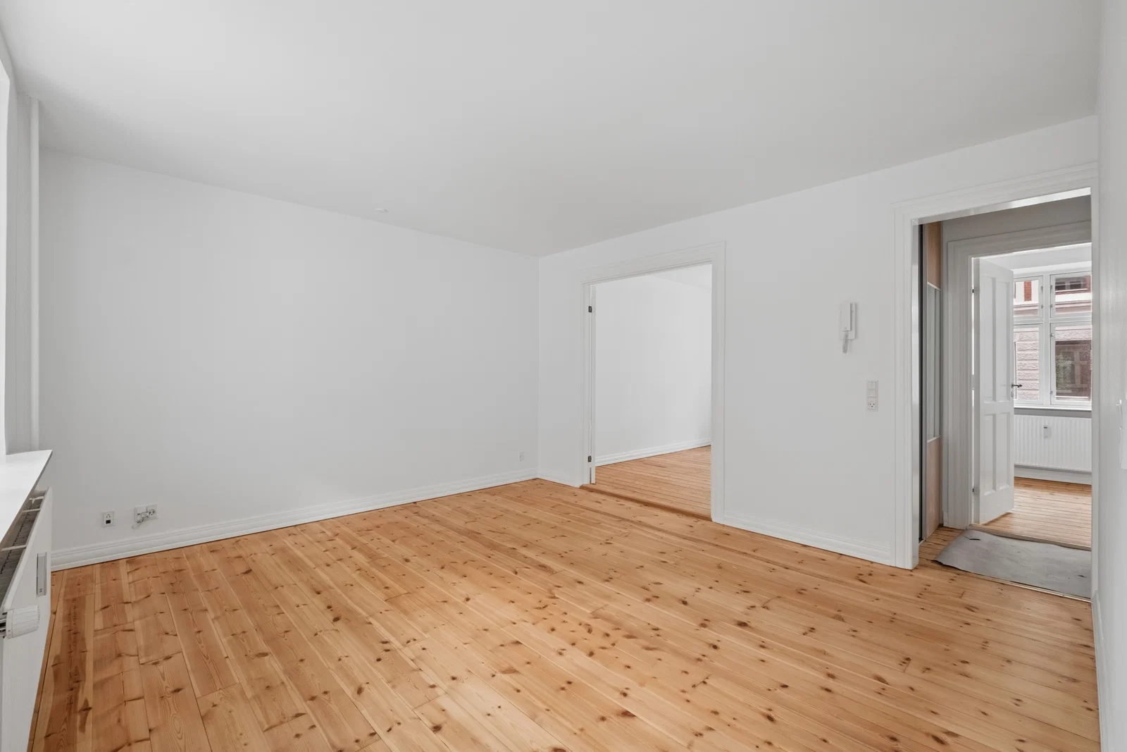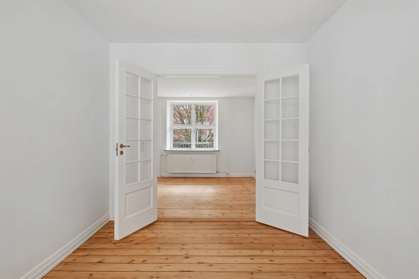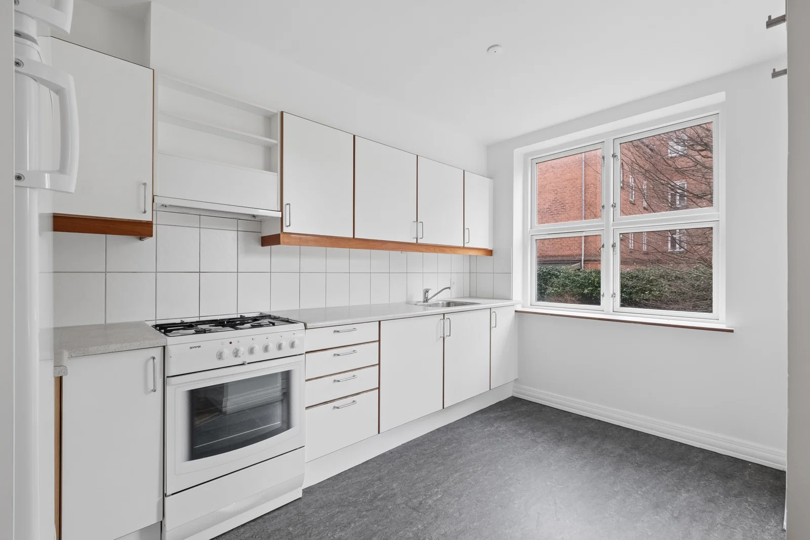 Lejligheden byder på et lyst opholdsrum, hvor de fine, afhøvlede plankegulve og store vinduer skaber en indbydende stemning. De franske glasdøre mellem rummene giver en elegant sammenhæng, mens køkkenet, der ligger i åben forbindelse med opholdszonen, præsenterer sig i et klassisk hvidt Biga-design med gode opbevaringsmuligheder. Her er også gulvvarme, som vil blive værdsat i de kolde måneder. Den sydvendte altan er perfekt til at nyde morgenkaffen eller et stille øjeblik i solen.