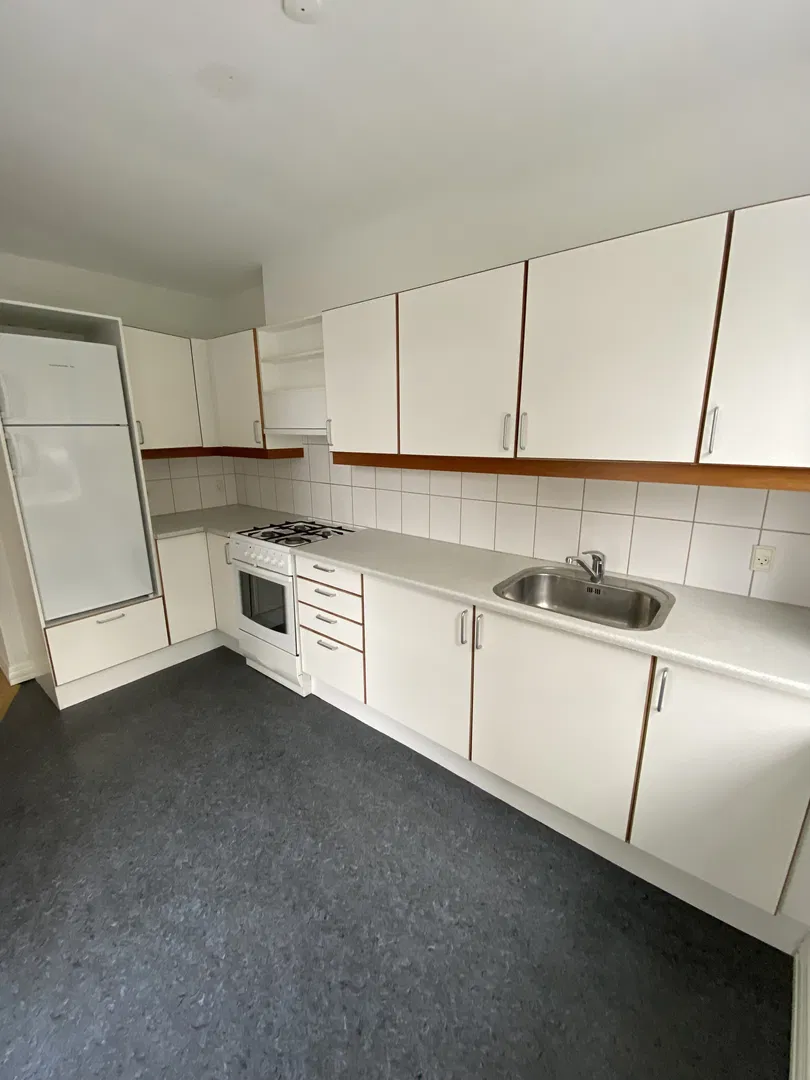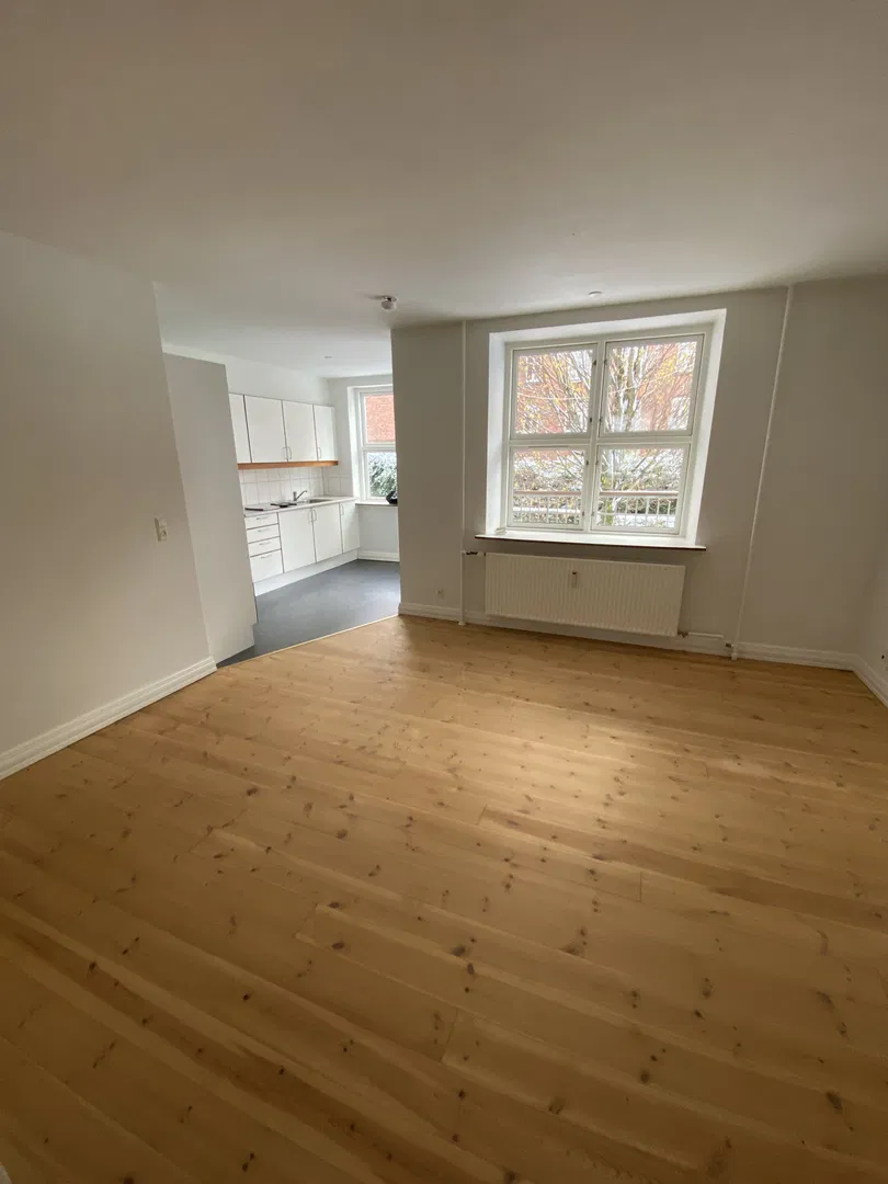 Lejligheden byder på et lyst opholdsrum, hvor de fine, afhøvlede plankegulve og store vinduer skaber et behageligt lysindfald. De franske glasdøre mellem rummene giver en smuk sammenhæng og fleksibilitet i indretningen. Køkkenet, i et klassisk hvidt Biga-design, fremstår indbydende med god skabsplads, komfur, emhætte og køle/fryseskab. Her er også linoleumsbelægning og gulvvarme, som tilføjer en ekstra komfort. Fra opholdszonen er der adgang til den sydvendte altan, hvor du kan nyde dagens lys i rolige omgivelser.