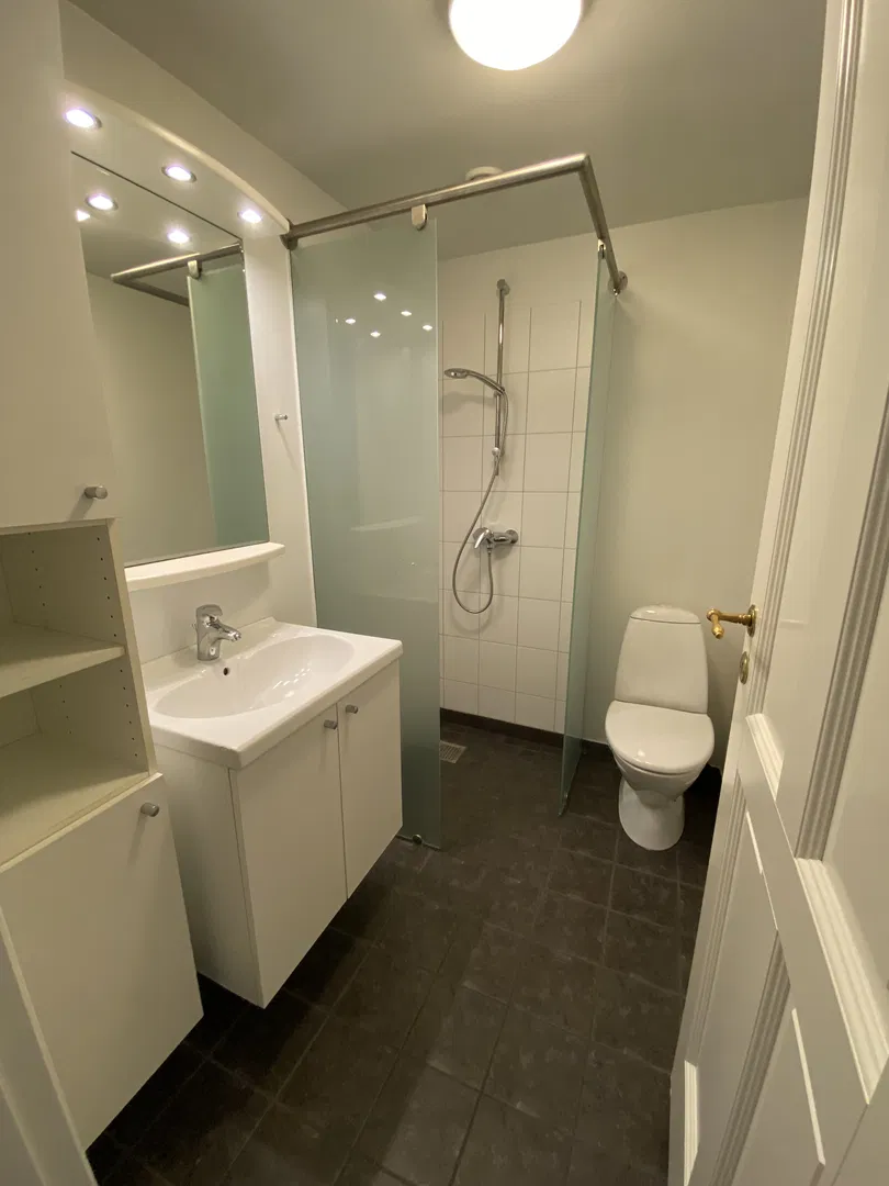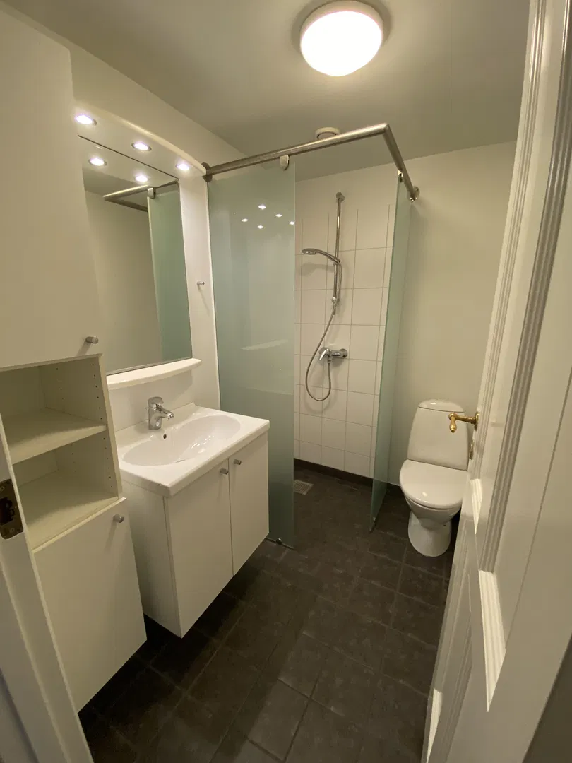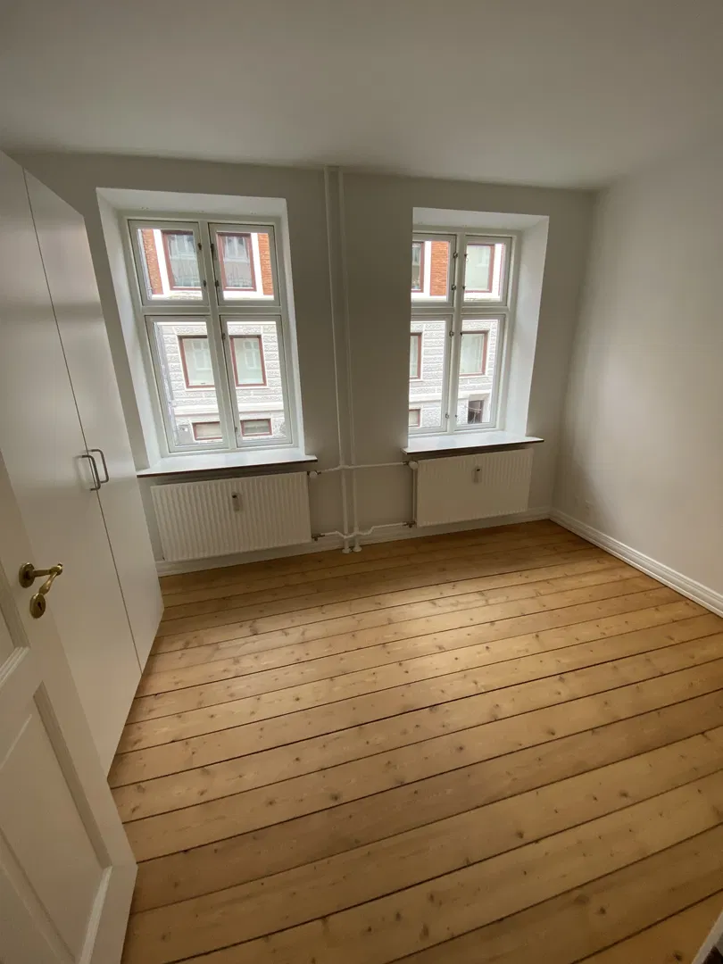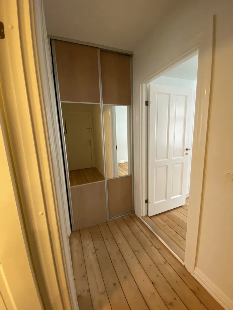 Boligen rummer to gode værelser, begge lyse og indretningsvenlige. Soveværelset har garderobeskab, mens entréen har et praktisk skab med skydelåger og spejl. Badeværelset er pænt og funktionelt, udstyret med bruseniche af glas, skabsplads, håndklædetørrer og gulvvarme. Planløsningen egner sig godt til deling med to separate værelser og et centralt opholdsrum, hvilket gør det nemt at indrette personligt.