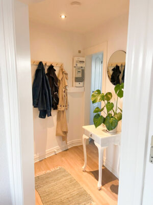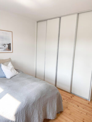 Lejligheden har et rummeligt soveværelse, der er udstyret med et skab med skydelåger, som giver god opbevaringsplads. I entreen er der også gipsloft med spot, som skaber en flot og indbydende atmosfære.