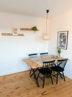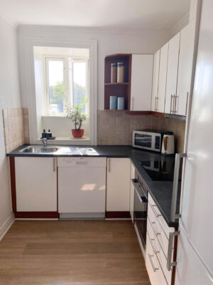 Lejligheden er udstyret med et nyere køkken, der er både stilfuldt og funktionelt. Køkkenet er komplet med induktionskogeplade, indbygningsovn, køle/fryseskab og opvaskemaskine – alt, hvad du behøver for at kunne tilberede dine måltider nemt og effektivt.