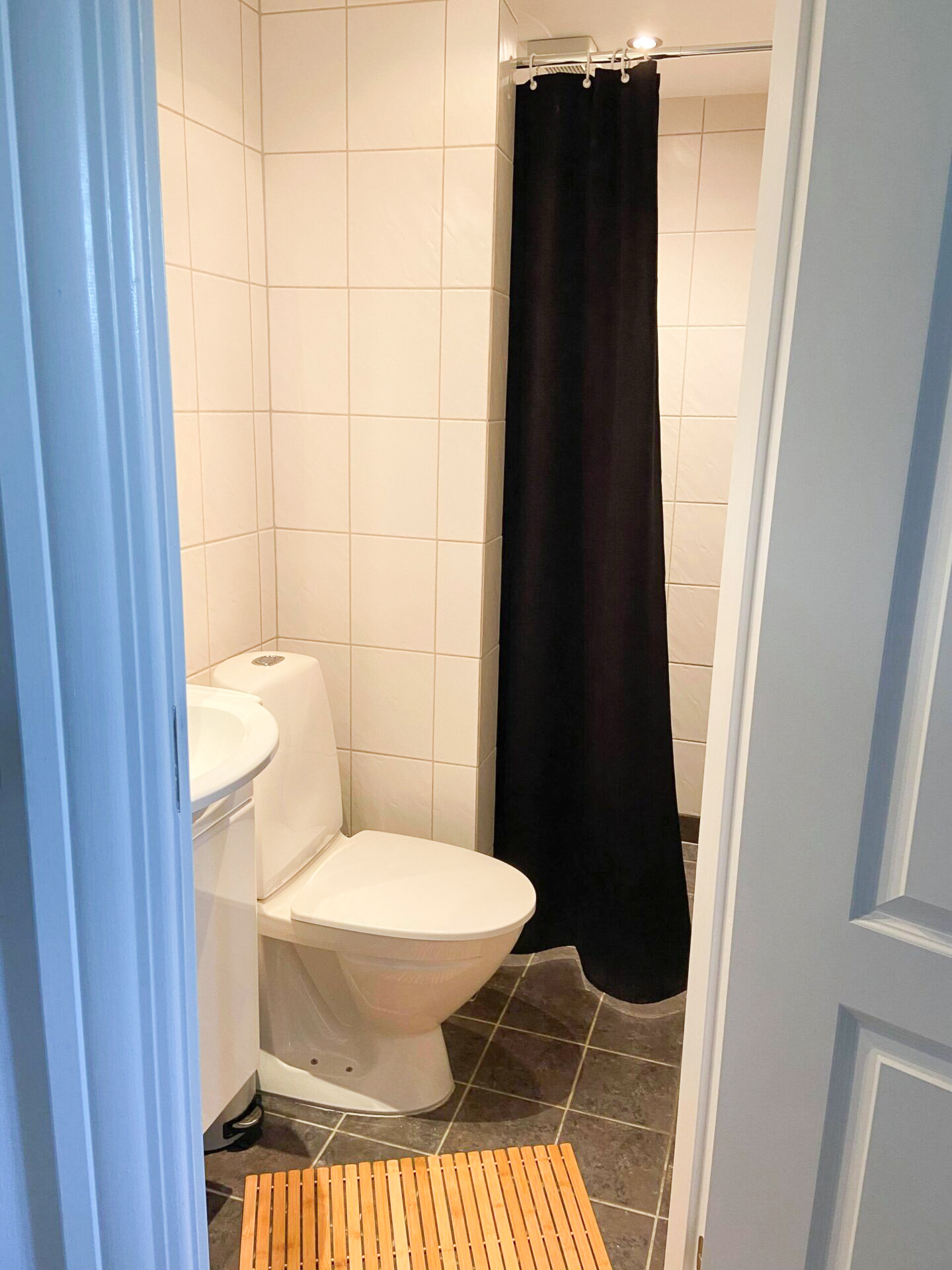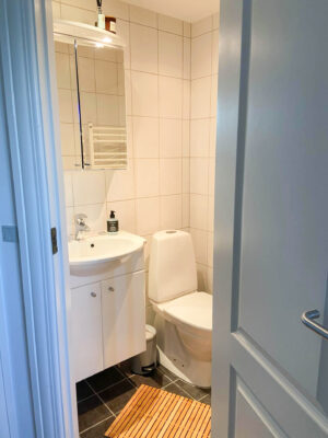 Badeværelset er både praktisk og elegant med klinker på både vægge og gulv, og det er udstyret med gulvvarme, som sikrer en behagelig temperatur året rundt. Her finder du desuden et vaskeskab og et spejlskab til opbevaring, samt en håndklædetørrer og en bruseniche. Loftet er færdiggjort med gips og spots, hvilket giver et moderne og lyst udtryk.