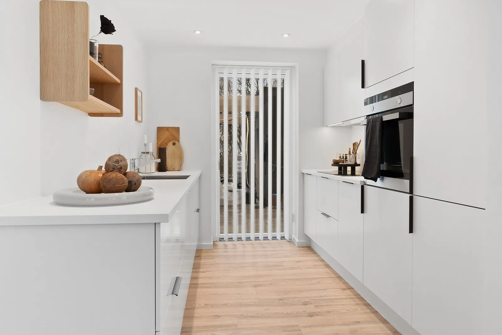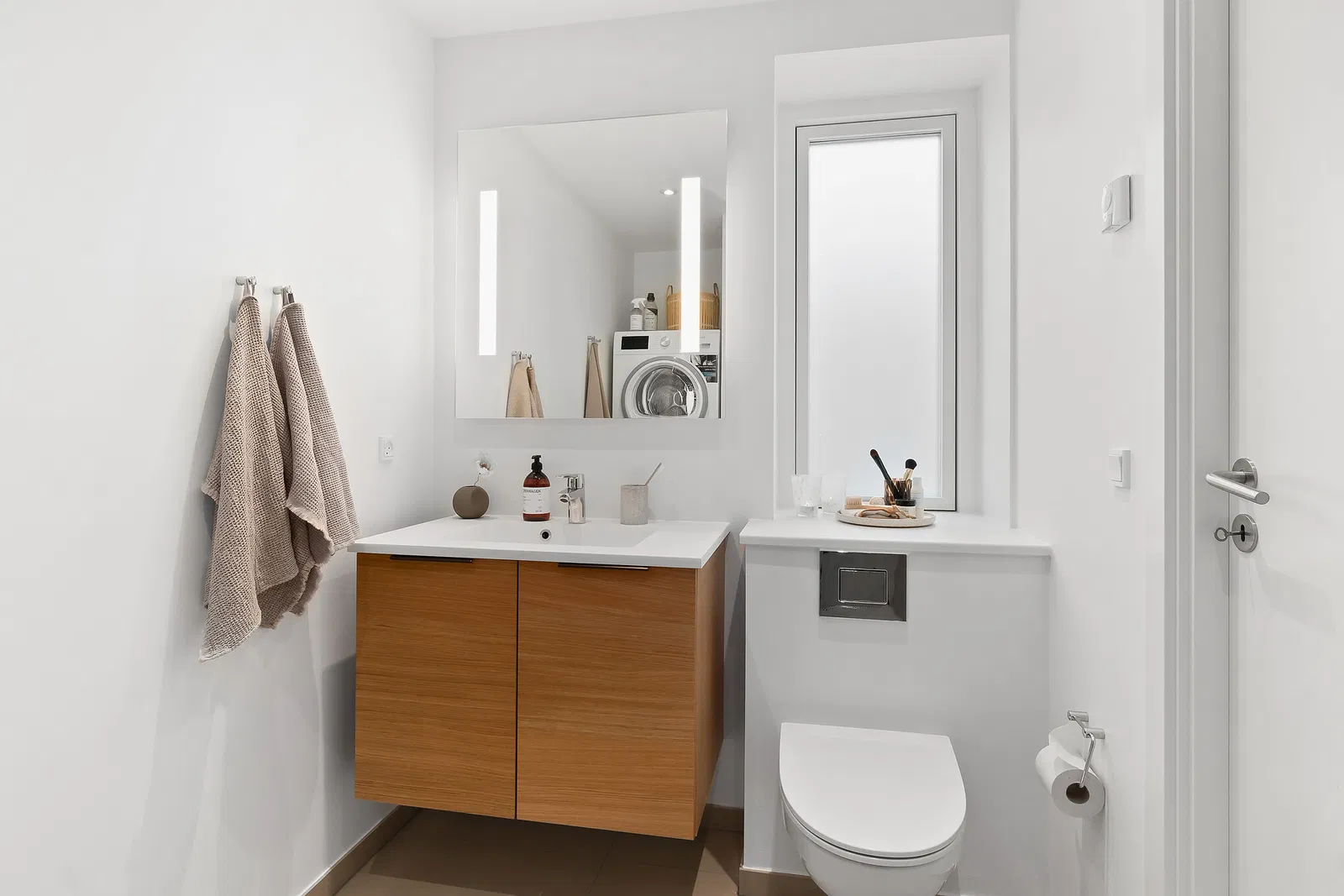 Stueplanets åbne planløsning skaber en naturlig forbindelse mellem entréen og det lyse spise- og opholdsrum. Det stilrene, hvide køkken er udstyret med generøs bord- og skabsplads samt integrerede hårde hvidevarer, herunder en stor induktionskogeplade og en effektiv emhætte. Fra opholdszonen kan du træde direkte ud på den private terrasse, hvor du kan nyde udelivet i fredelige omgivelser. Stueetagen byder også på et praktisk badeværelse med bruseniche og vaskesøjle, hvilket gør hverdagen lettere.
