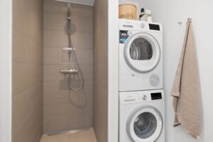 På førstesalen finder du et stort soveværelse og to lyse værelser – alle med loft til kip, som giver en skøn rumfornemmelse. Rækkehuset har to badeværelser med bruseniche, og i stueetagen er der desuden vaskesøjle med både vaskemaskine og tørretumbler.