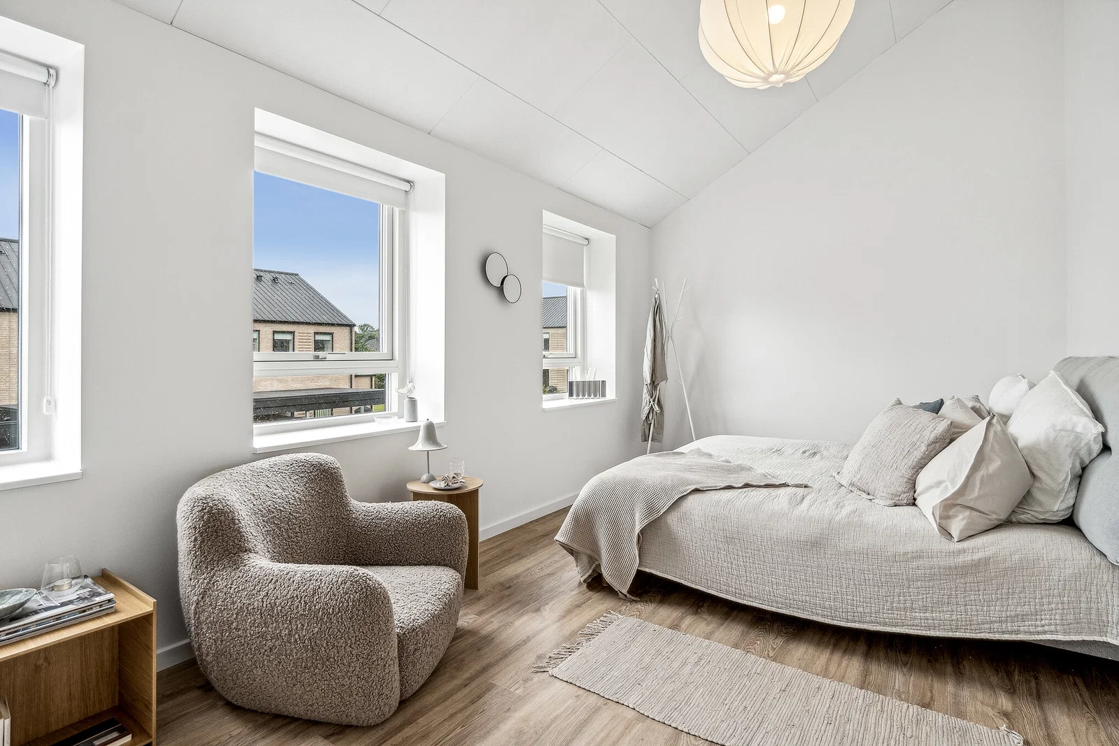 På første sal finder du et stort soveværelse og to indretningsvenlige værelser, alle med loft til kip, der giver en følelse af rummelighed. Her er der plads til både kontor og gæsteværelse, og det ekstra badeværelse med bruser gør morgenrutinerne lette. Generelt er boligen præget af lyse vægge og varme gulve, der skaber en rolig atmosfære, let at indrette personligt.