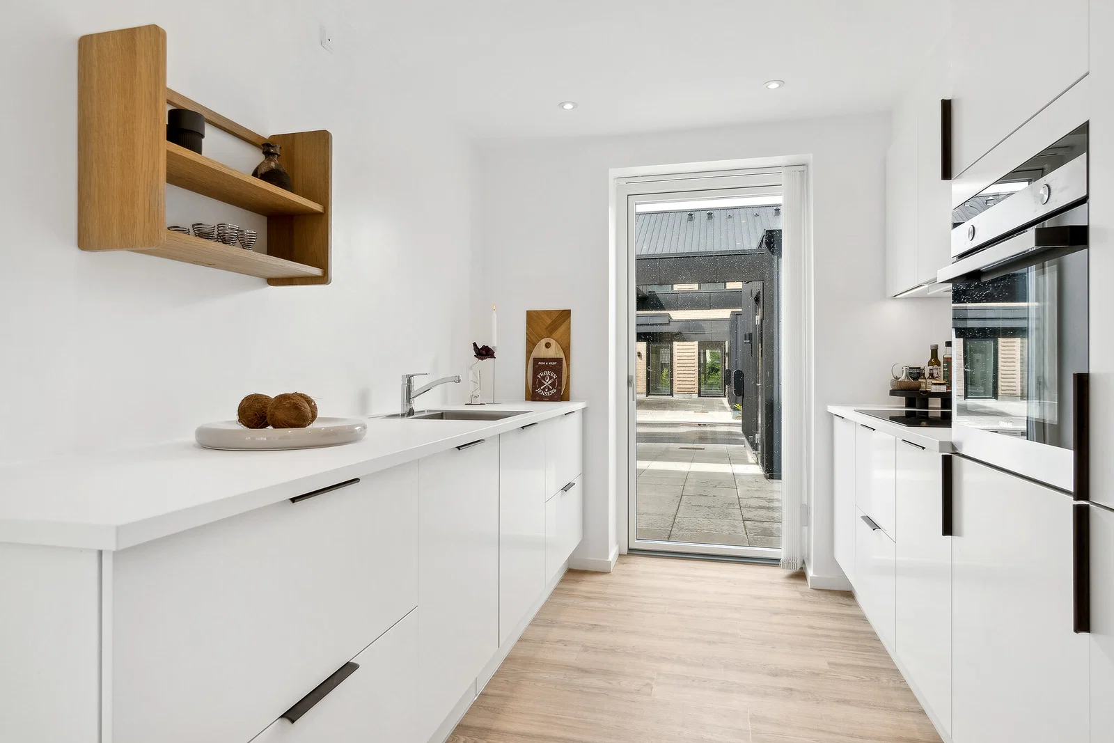 Stueplanet byder på et rummeligt alrum, der elegant forener spise- og opholdsstue med et stilrent køkken. Det lyse køkken er udstyret med glatte fronter, integrerede hvidevarer herunder en induktionskogeplade og opvaskemaskine, hvilket skaber en praktisk og indbydende ramme om madlavningen. De brede vinduespartier i opholdsrummet giver et dejligt lysindfald og mulighed for udgang til den private terrasse, der er perfekt til afslapning og leg i grønne omgivelser. Et rummeligt badeværelse med bruseniche samt en vaskesøjle med vaskemaskine og tørretumbler fuldender stueetagen.