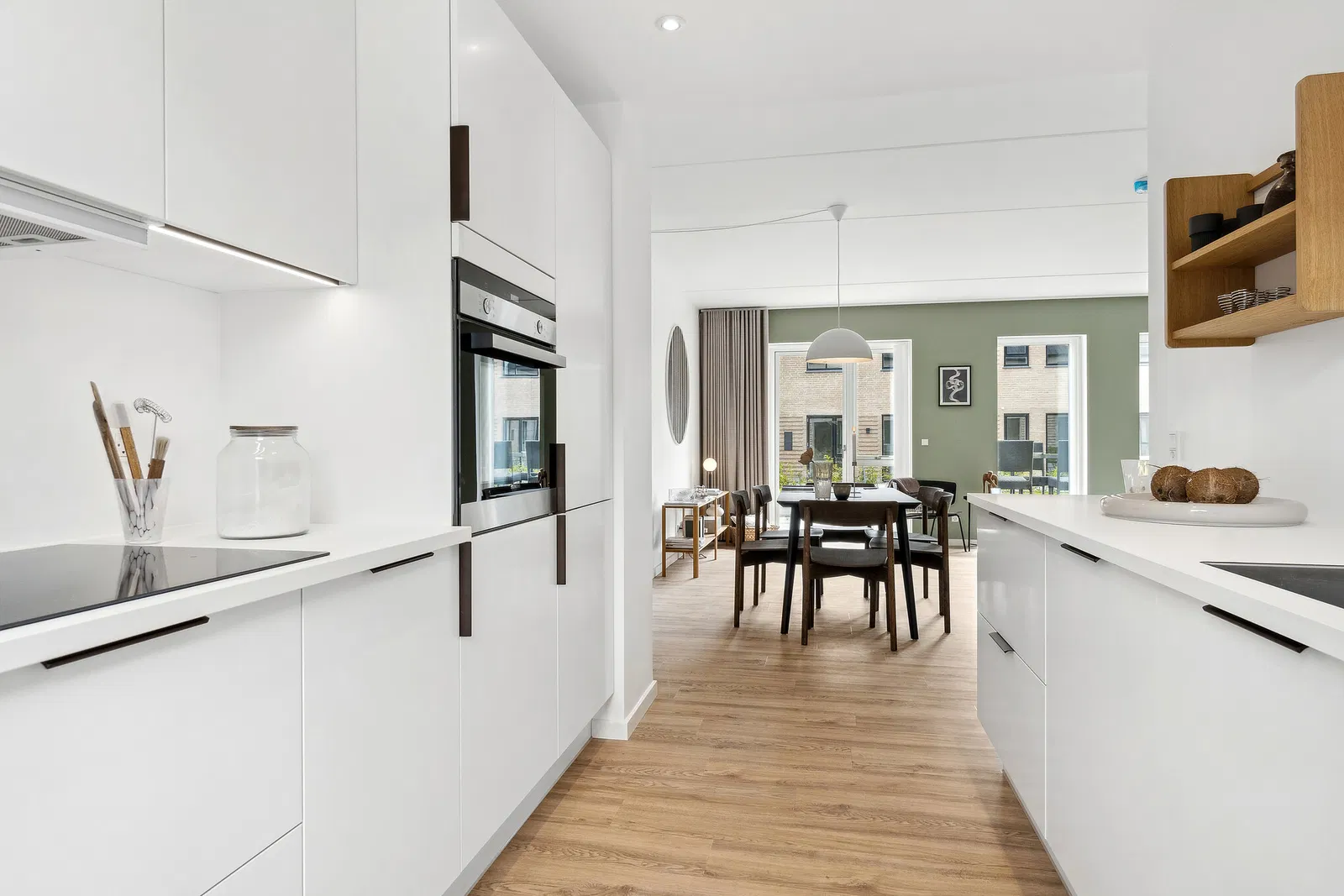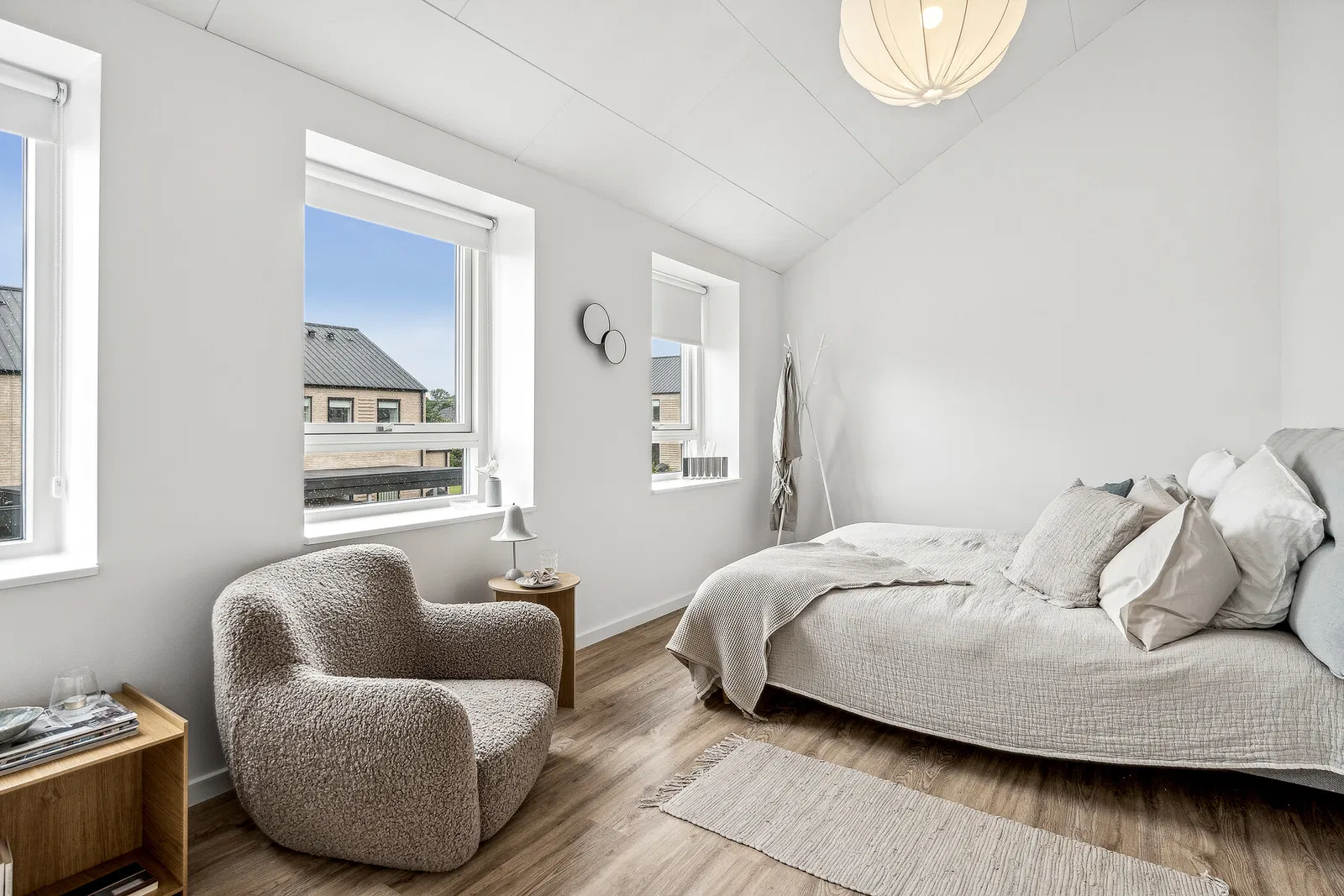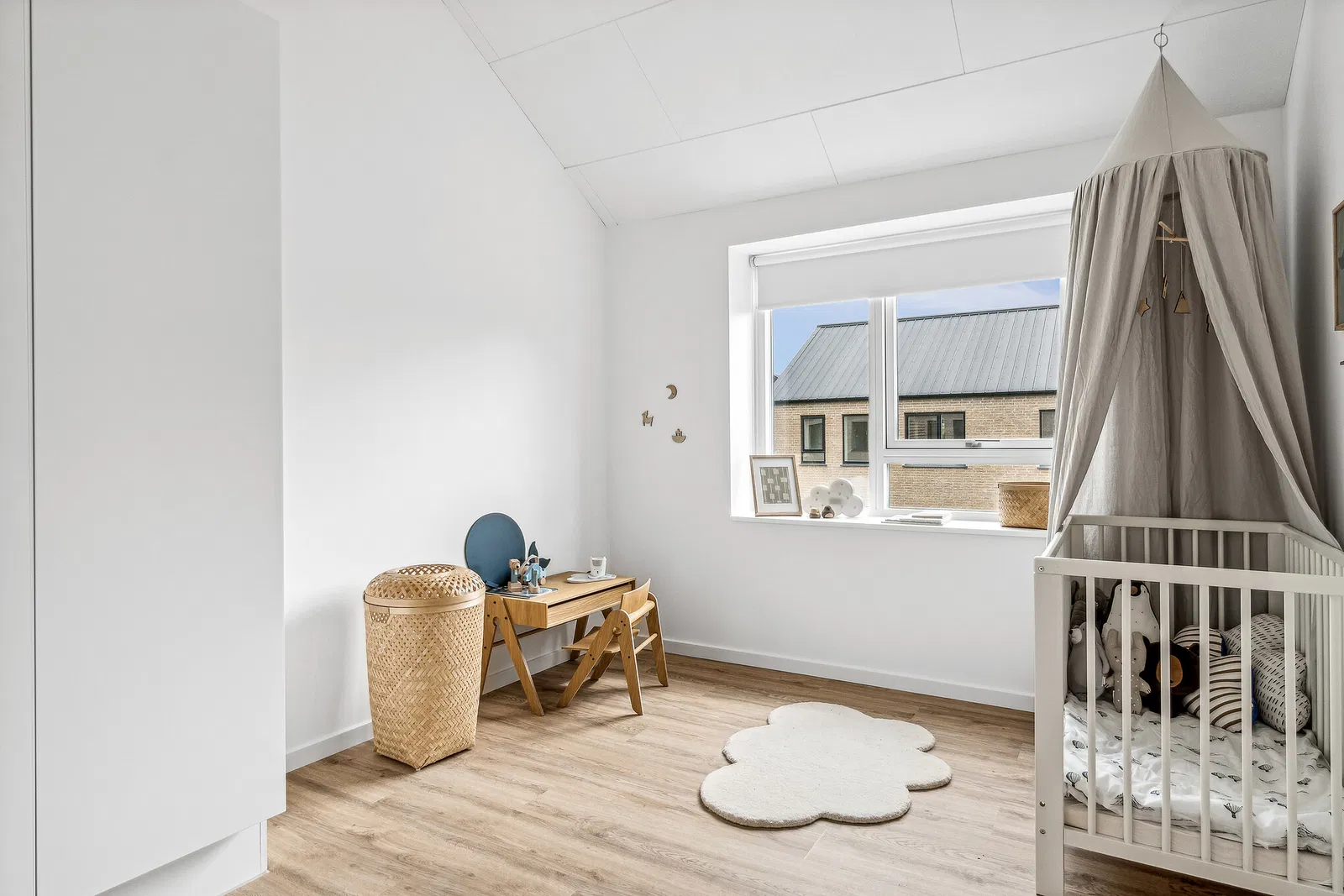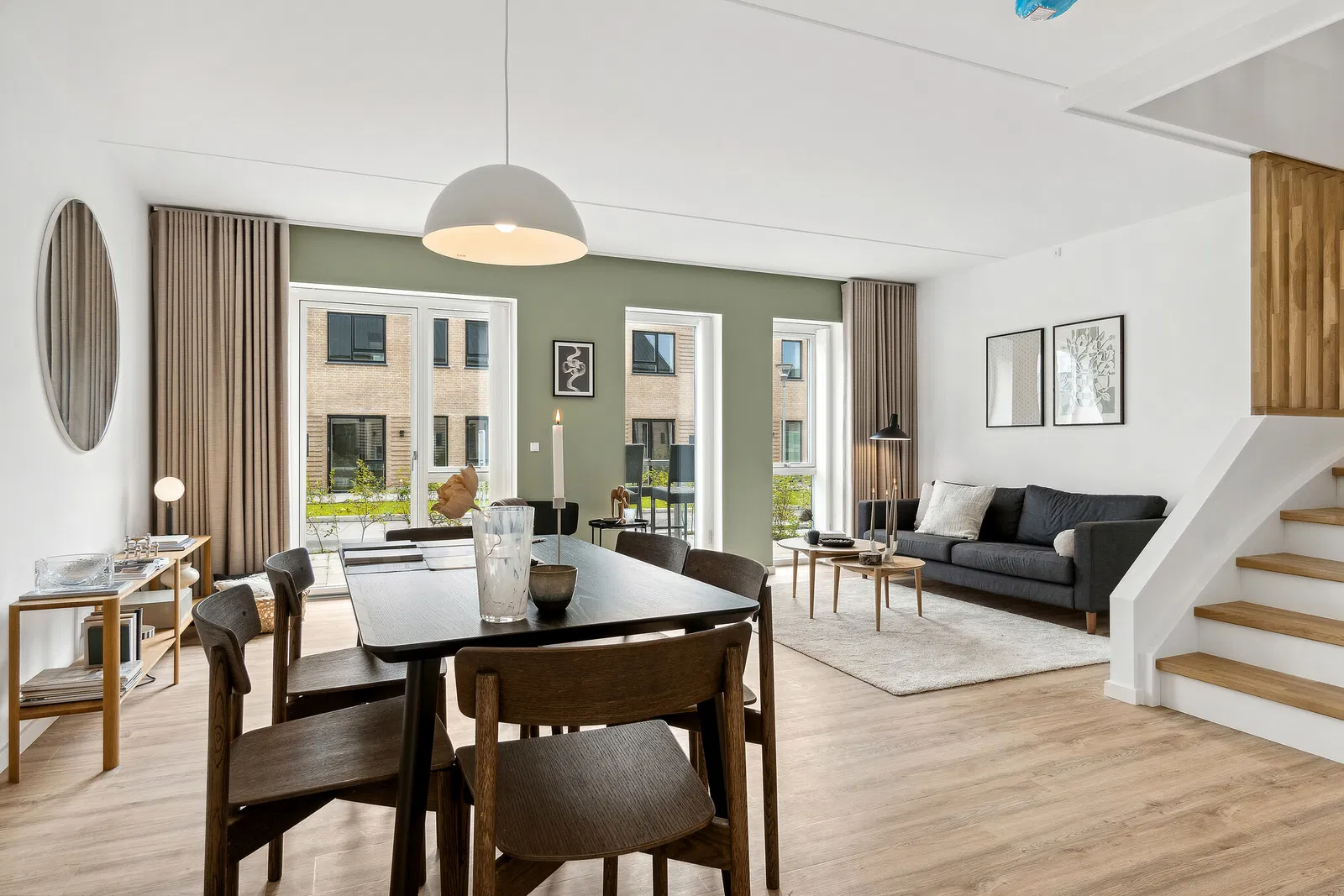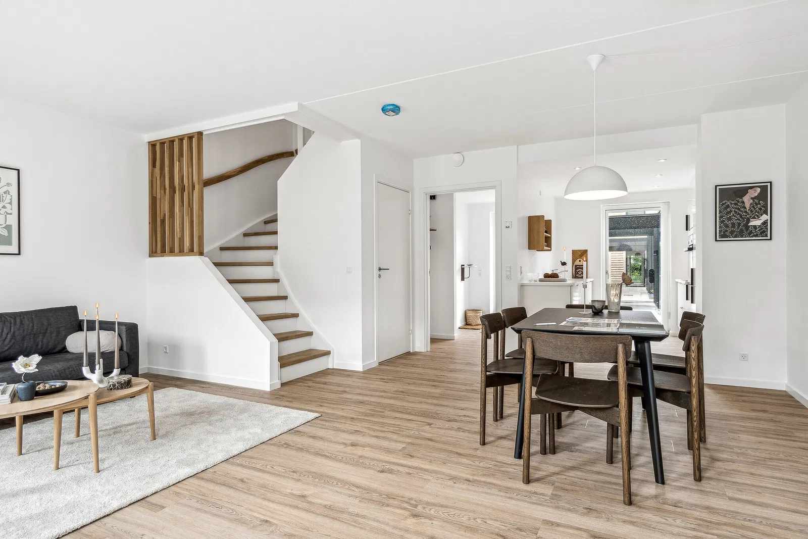 Boligen byder på 115 veludnyttede kvadratmeter fordelt på to etager. Stueplanet fungerer som hjemmets naturlige samlingspunkt med et indbydende køkken-alrum og stue, der åbner sig mod den private flisebelagte terrasse. De store vinduespartier skaber et behageligt lysindfald, mens det stilrene køkken er udstyret med integrerede hårde hvidevarer og god skabsplads. Her finder du også et moderne badeværelse med vaskesøjle, der gør hverdagen nemmere. På 1. sal venter et stort soveværelse samt to indretningsvenlige værelser, alle med loft til kip, der giver en luftig rumfornemmelse. Et ekstra badeværelse gør morgenrutinerne lettere.