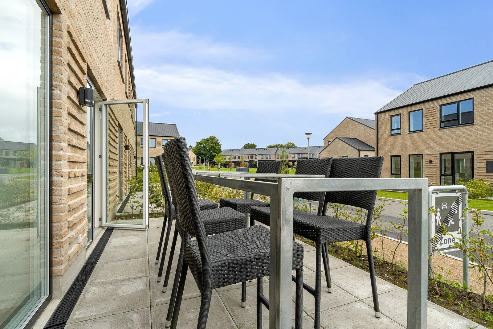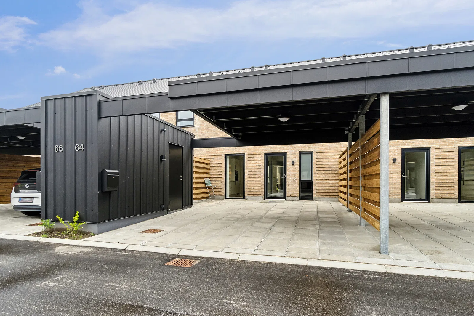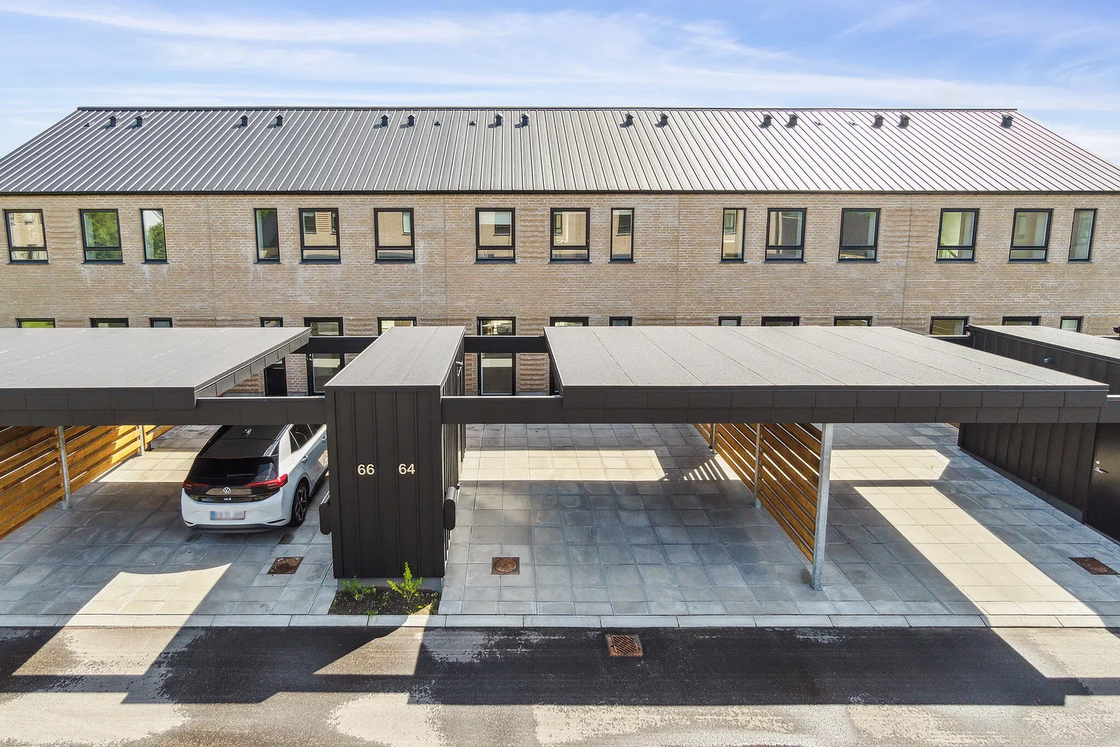 Rækkehuset er en del af et velanlagt kvarter med grønne fællesarealer, der skaber et roligt og trygt miljø. Foran huset er der en overdækket carport med plads til to biler og et redskabsrum. Den private terrasse på havesiden er perfekt til hyggelige stunder udendørs, mens terrassearealet ved forsiden giver mulighed for at nyde solen hele dagen.