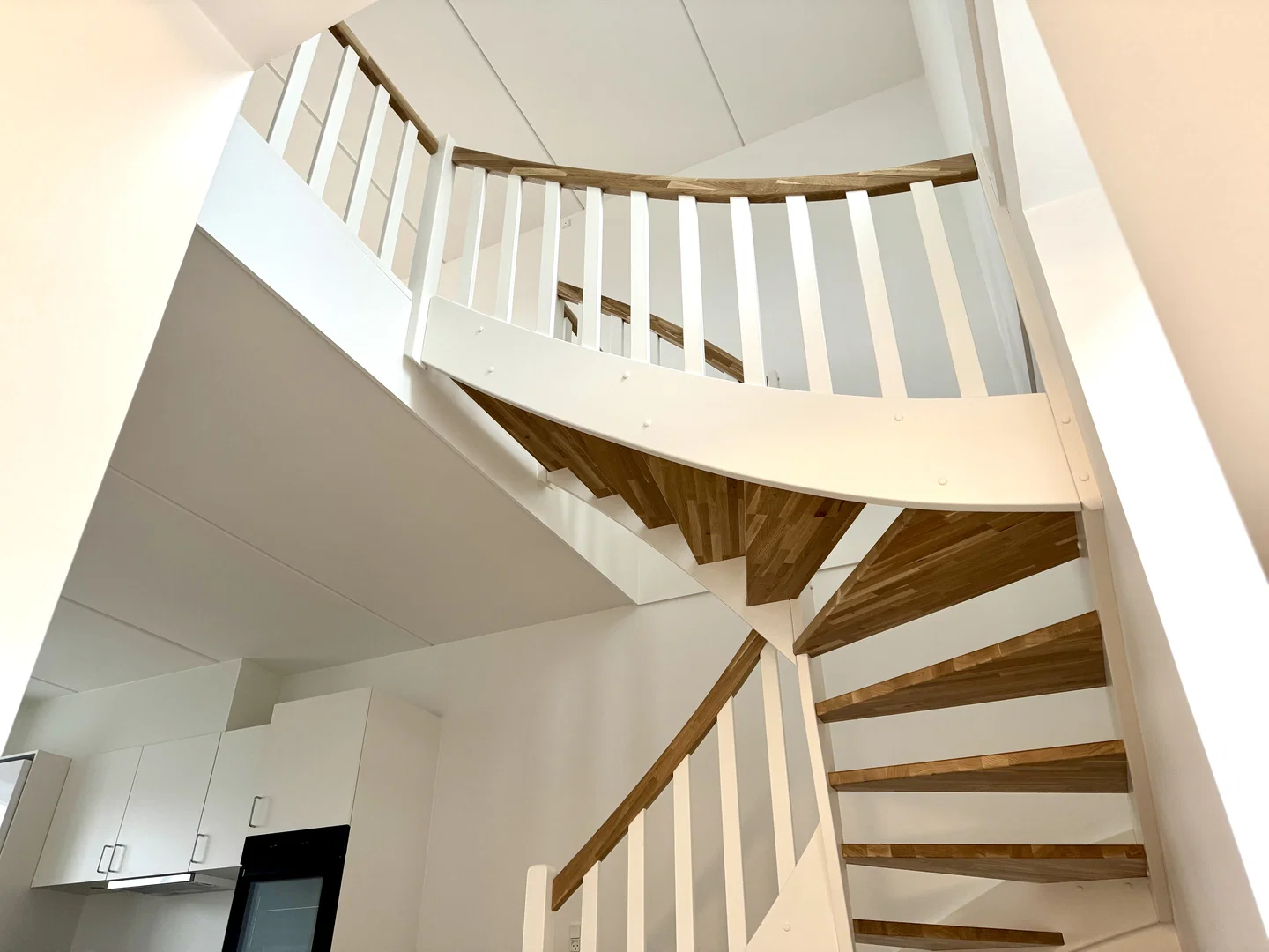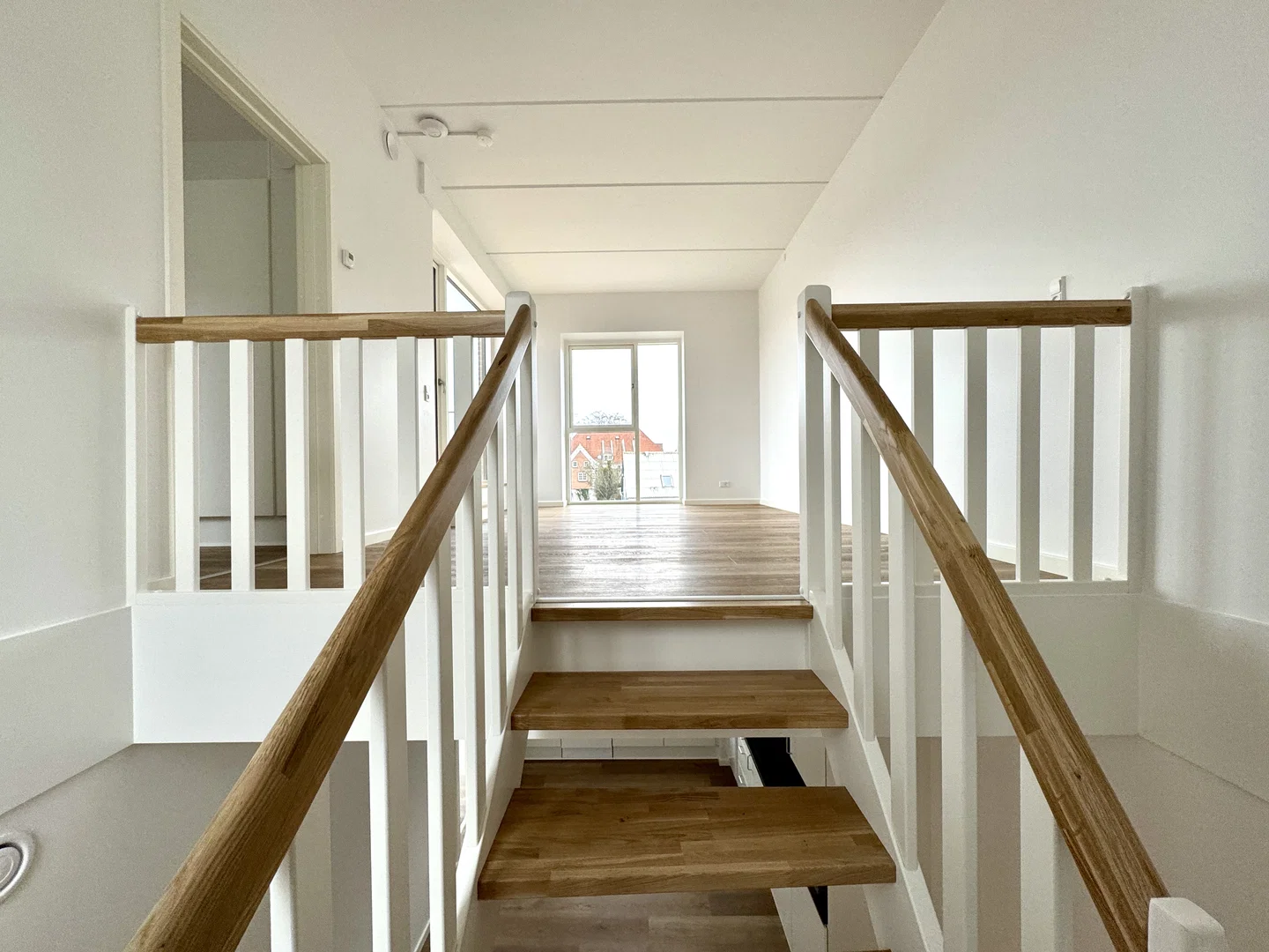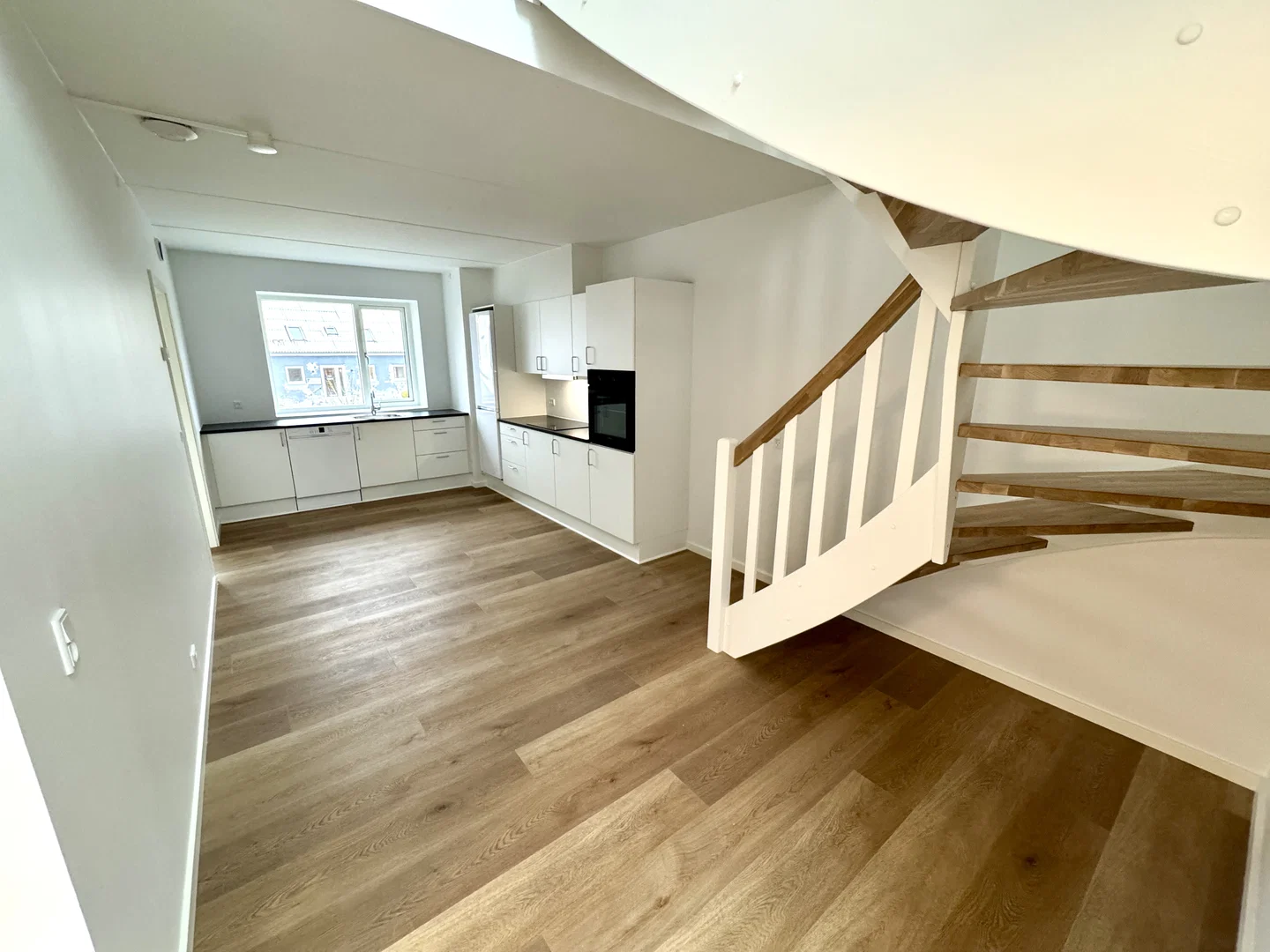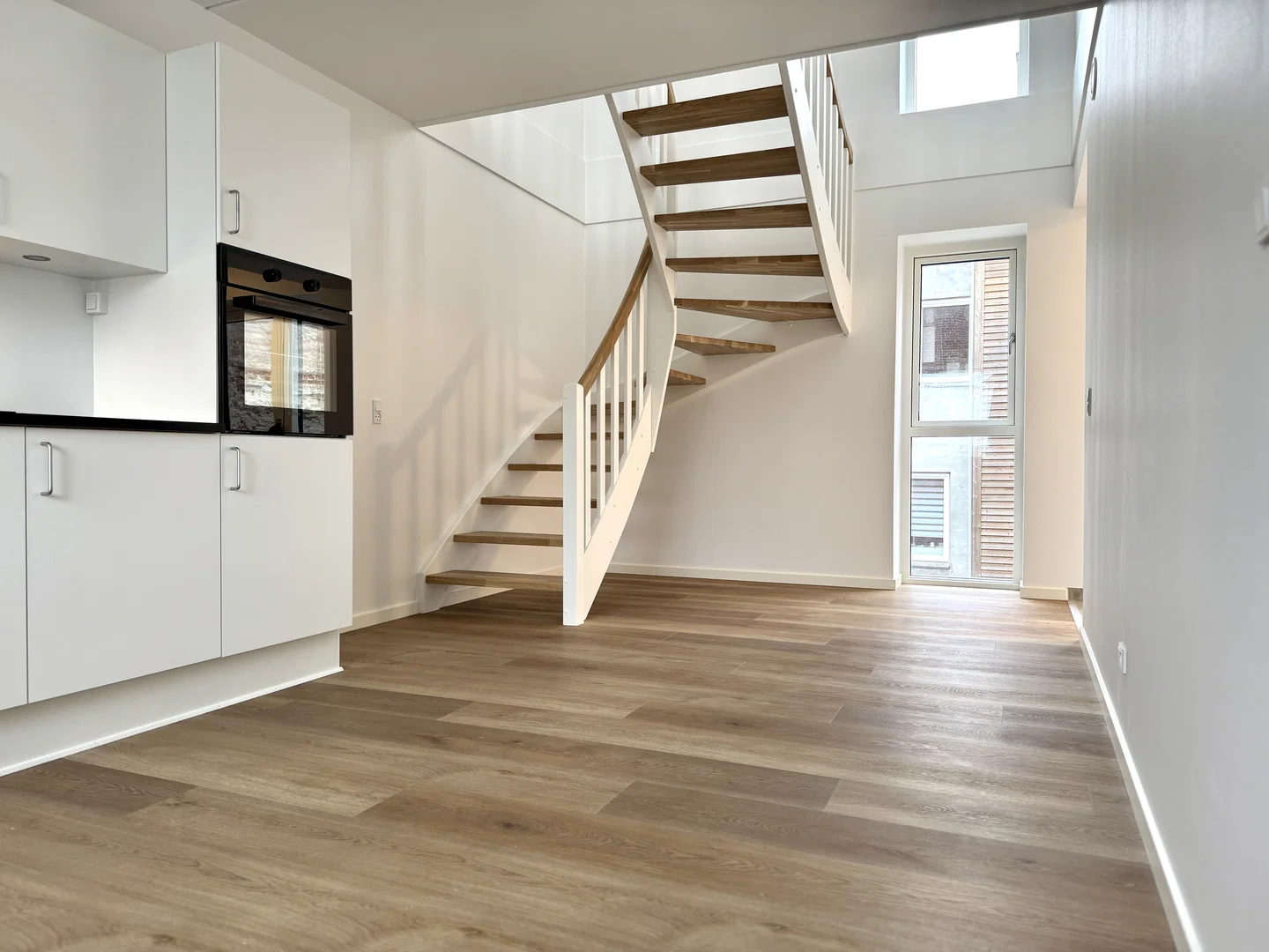 Lejligheden byder på et lyst opholdsrum i åben forbindelse med et stilrent køkken. Køkkenet er indrettet med hvide elementer og en elegant sort bordplade, komplet med integrerede hårde hvidevarer som ovn, kogeplade, køle-/fryseskab og opvaskemaskine. Her er der god plads til spisebord, og stuen indrettes nemt med sofa og TV. De store vinduespartier skaber et behageligt lysindfald og en rolig udsigt til kvarteret. En elegant trappe med egetræstrin fører op til den øvre etage, hvor et stort, lyst rum venter med udgang til en rummelig altan, ideel til hyggelige stunder udendørs.