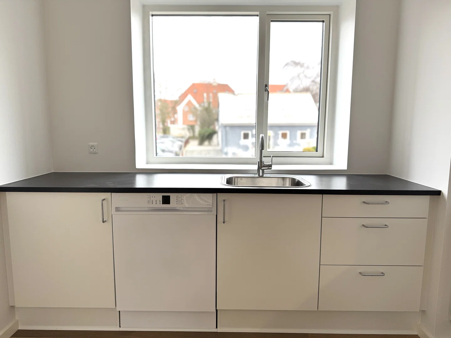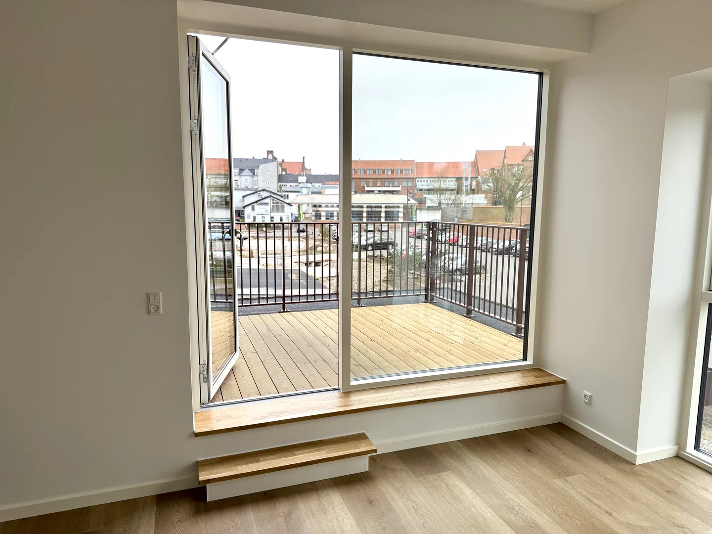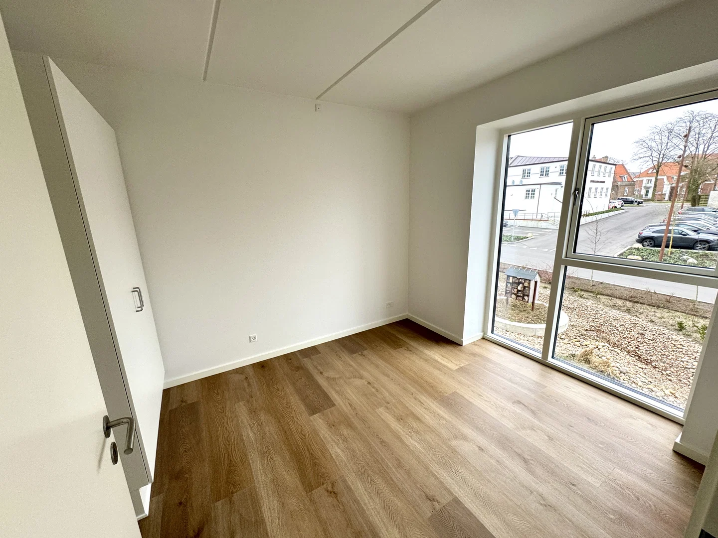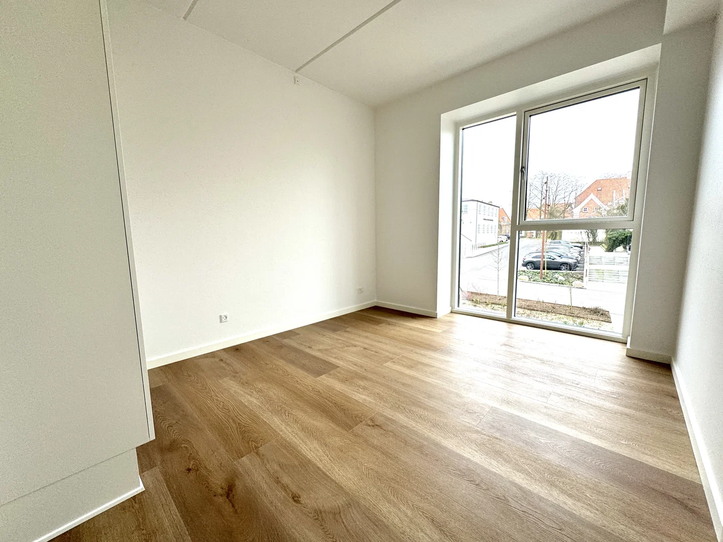 Lejligheden byder på et lyst opholdsrum i åben forbindelse med et stilrent køkken. Køkkenet er indrettet med hvide elementer og en elegant sort bordplade, komplet med integrerede hårde hvidevarer som ovn, kogeplade, køle-/fryseskab og opvaskemaskine. Her er der god plads til spisebord, og stuen indrettes nemt med sofa og TV. De store vinduespartier skaber et behageligt lysindfald og en rolig udsigt til kvarteret. En elegant trappe med egetræstrin fører op til den øvre etage, hvor et stort, lyst rum venter med udgang til en rummelig altan, ideel til hyggelige stunder udendørs.