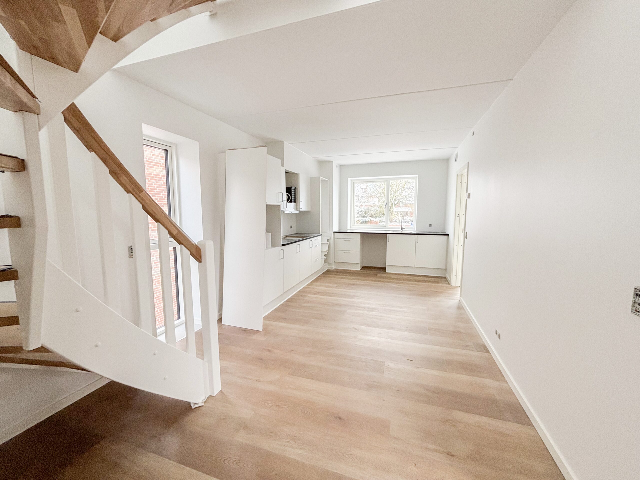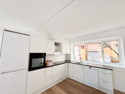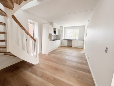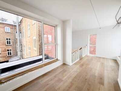 På de to øverste etager finder du en 95-100 m² 3-værelses lejlighed, hvor der er adgang via egen trappe fra gården. Lejligheden har på øverste niveau hele to tagterrasser, så man har rig mulighed for at nyde solen og udsigten over byen.