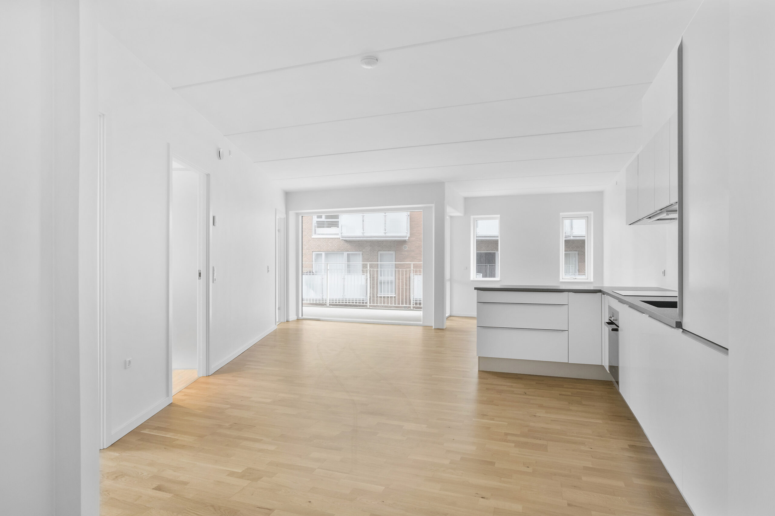 Lejligheden byder på en indbydende planløsning med et stort, lyst køkken-alrum, hvor køkken og stue smelter sammen i ét. Her er der plads til både hverdagens aktiviteter og hyggelige stunder med gæster. Det rummelige badeværelse er elegant indrettet med flotte klinker i travertinlook og har både god skabsplads og et vindue, der lader lyset strømme ind. De to værelser, herunder et lyst soveværelse, er udstyret med indbyggede skabe og sikrer optimal opbevaringsplads. Fra både stuen og soveværelset er der udgang til en stor altan, hvor man kan nyde udsigten over Jyllandsgade.