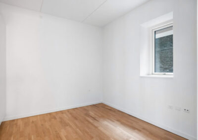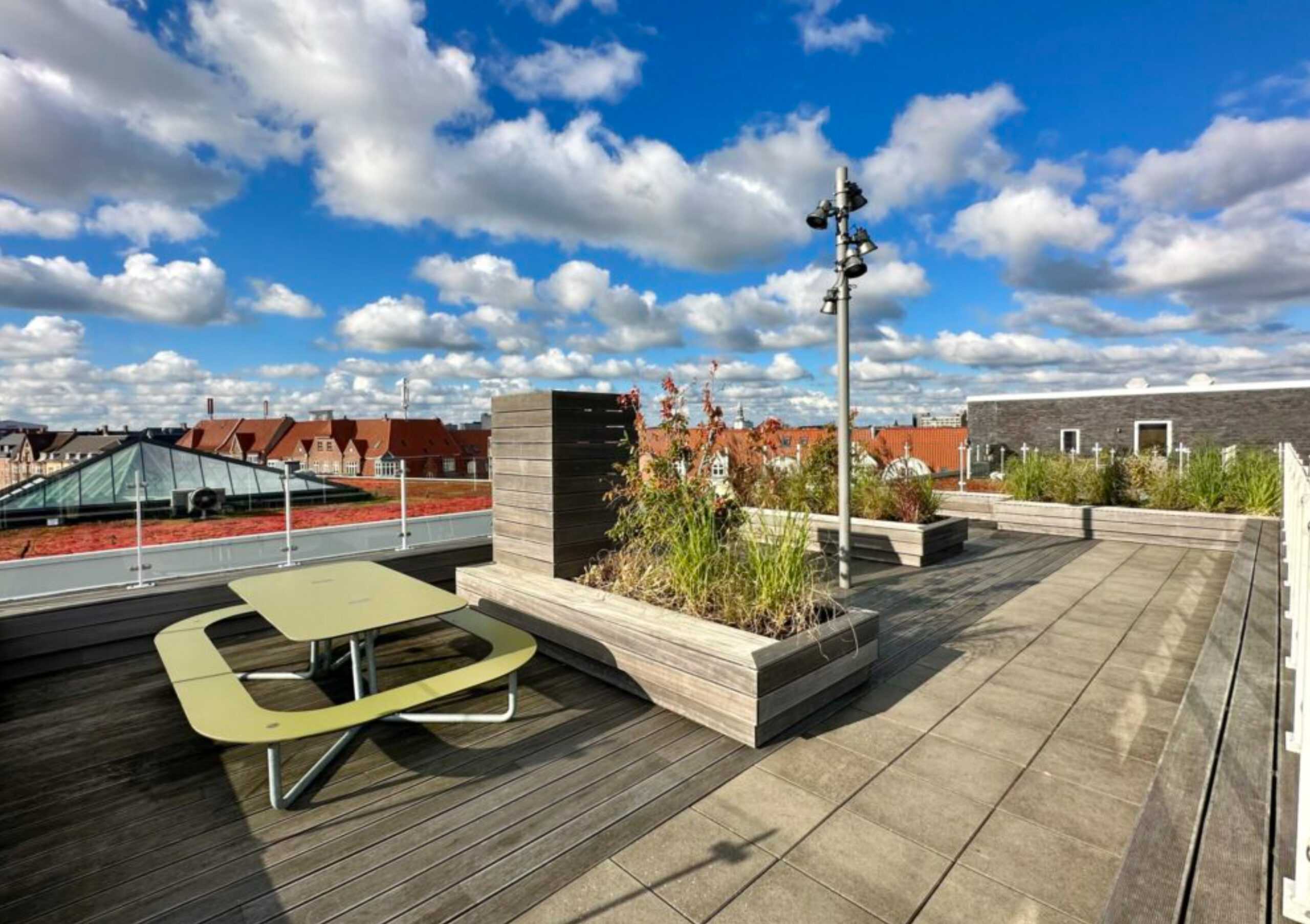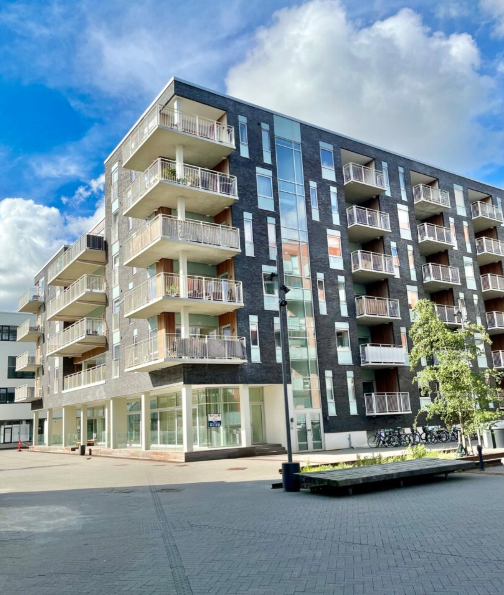 På 1. sal er der en smuk atriumgård med springvand, levende planter og fælles lounge, og på 5. sal dejlig fælles tagterrasse – hvor der er rig mulighed for at nyde sommersolen og udsigten over byen. Ejendommens kælder rummer kælderrum til lejlighederne og en lækker parkeringskælder med bilelevator, hvor der kan lejes en fast nummereret parkeringsplads.