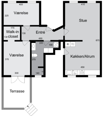 Lejligheden er 88 m2 og indeholder entre, køkken/alrum med spiseplads, stue, 2 soveværelser og badeværelse, med brusekabine samt vaskemaskine og tørretumbler. Der er ligeledes egen terrasse med adgang fra det ene soveværelse. Der medfølger eget cykelskur til lejligheden. Til ejendommen medfølger også en have som er til fri afbenyttelse.