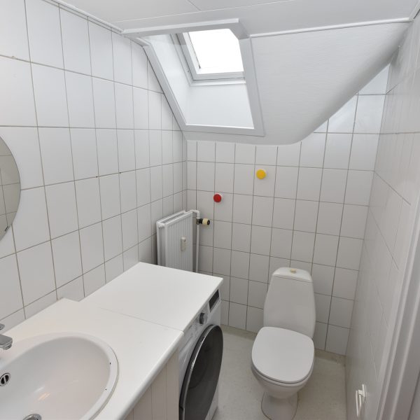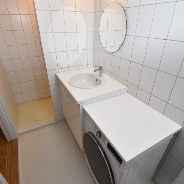 Badeværelset er lyst og funktionelt med hvide fliser, stor afskærmet bruseniche, opbevaringsskab og spejl – og der installeres en ny kombineret vaskemaskine/tørretumbler.