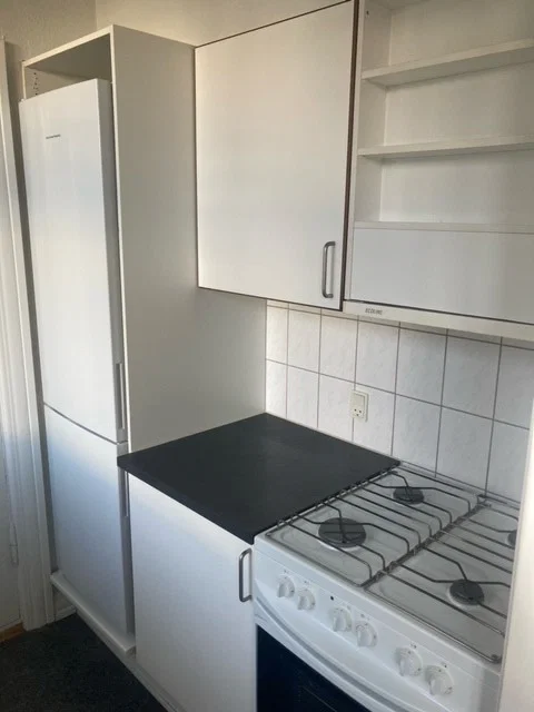 Lejligheden byder på en indbydende entré med linoleumsgulv og indbyggede spots, der leder videre til et lyst og veludnyttet køkken. Her finder du et hvidt køkken med kirsebærkanter og mørk bordplade, samt et praktisk vindue, der sikrer et dejligt lysindfald. Køkkenet er udstyret med komfur med ovn, køle-/fryseskab og emfang, hvilket gør det let at holde pænt. Stuen og soveværelset ligger i forlængelse af hinanden og fremstår lyse og indretningsvenlige med gennemgående fyrretræsgulve og diskrete loftlister, hvilket giver et klassisk udtryk.