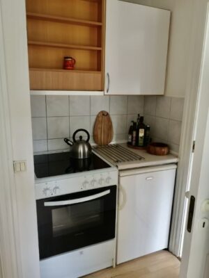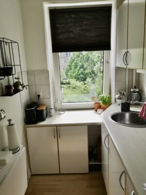 Stuen og soveværelset ligger ved siden af hinanden, hvilket giver en praktisk og sammenhængende indretning. Adgang til køkkenet opnås gennem det ene værelse, og køkkenet selv, selvom ældre, er i god stand og stråler med sin hvide elegance. Mens du forbereder måltider, kan du nyde udsigten til den skønne gårdhave, der giver mulighed for afslapning og rekreation.
