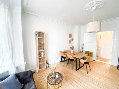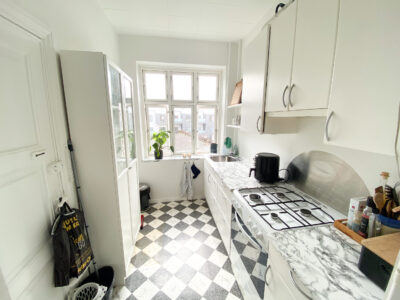 Lejligheden er super charmerende med sit herskabelige udseende og store rum med store vinduer. Lejligheden er bestående af en lang fordelingsgang, hvor man kan sætte nogle skokasser op og hænge nogle knager op.