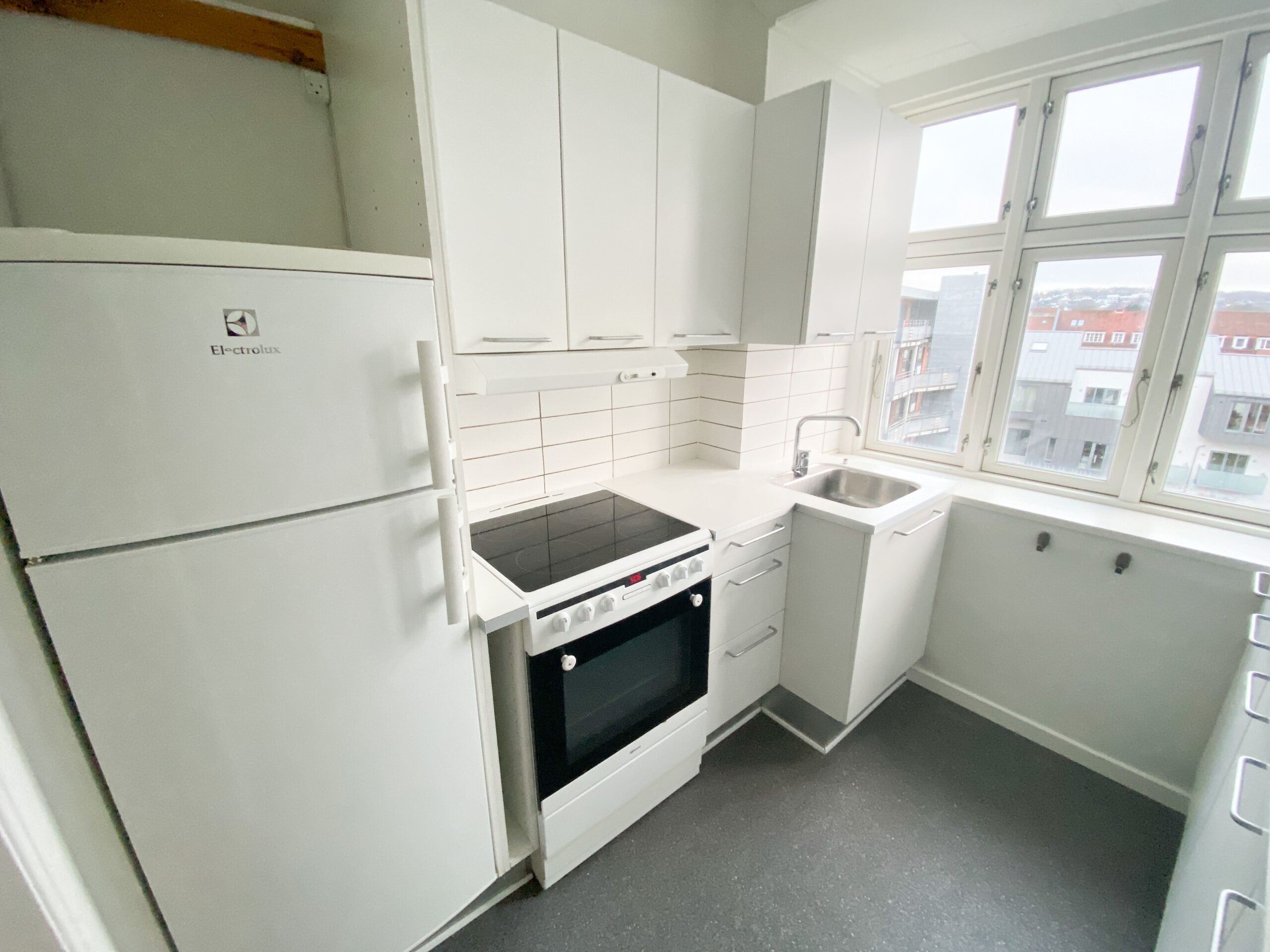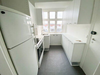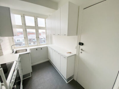 Køkkenet er lyst og moderne med hvide elementer og et elegant sort laminatgulv. Det fremstår tidssvarende og er et ideelt sted at kokkerere og hygge sig. Fra bagtrappen er der adgang til kælderen, hvor der findes et praktisk depotrum samt et fælles vaskeri.