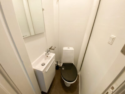 Når du træder ind, mødes du af en rummelig fordelingsgang med et indbygget skab – ideelt til opbevaring af overtøj og sko. Herfra er der adgang til et separat toiletrum med en lille håndvask, så boligen har funktionelle faciliteter til dagligdagen.