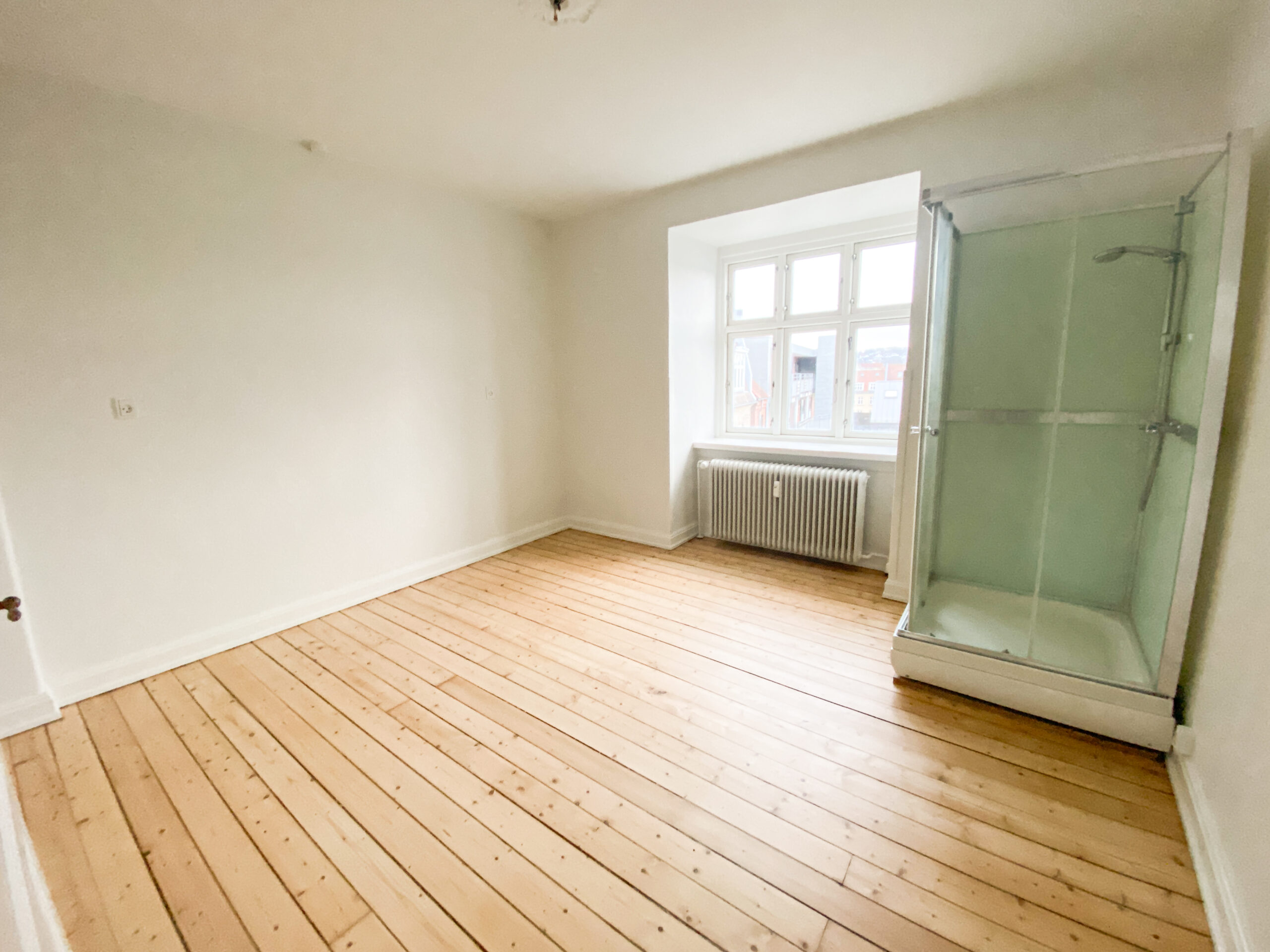 Soveværelset er rummeligt og lyst med et stort vinduesparti, der sikrer et behageligt lysindfald. Her er plads til både en stor seng og et klædeskab. En ekstra praktisk detalje er den separate brusekabine, der er placeret i soveværelset – en smart løsning, der adskiller badefaciliteterne fra toilettet.