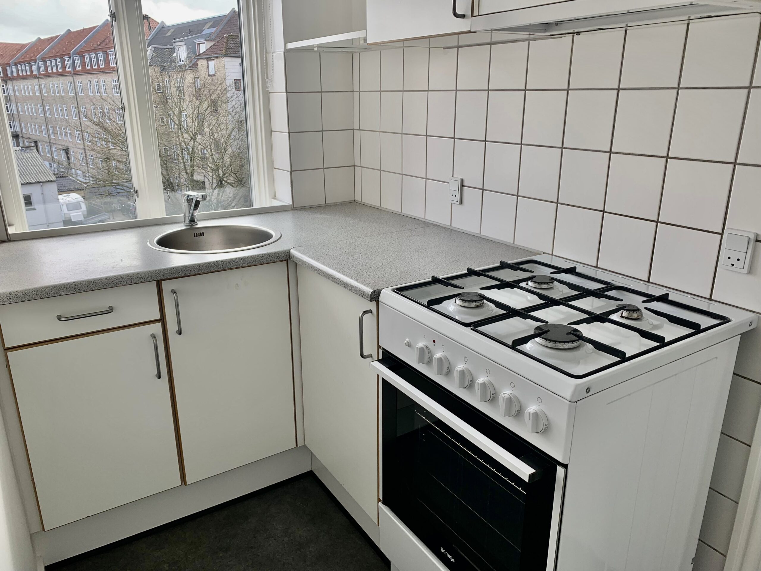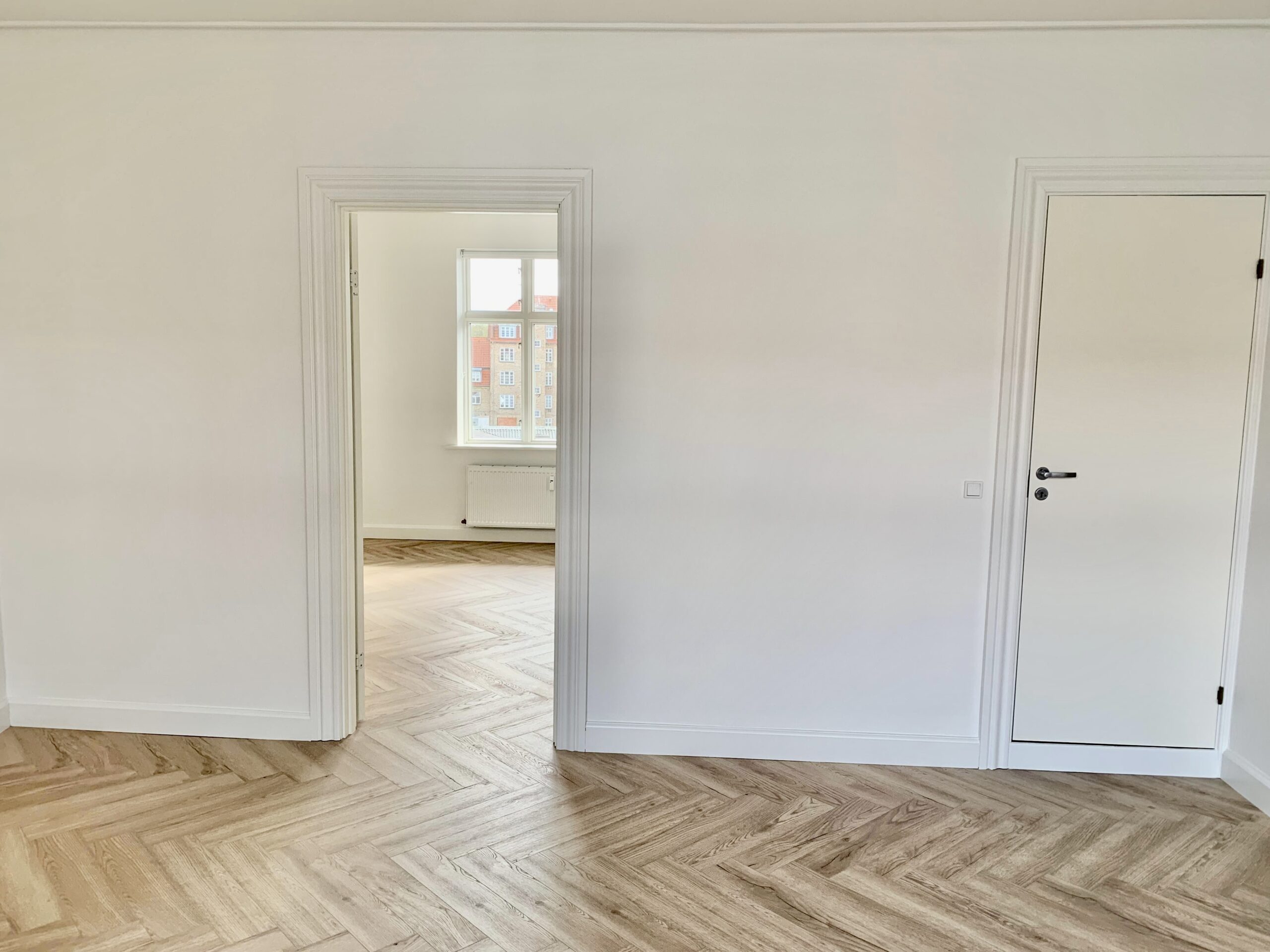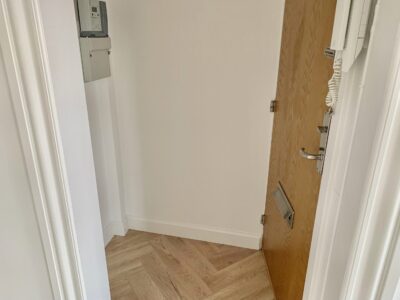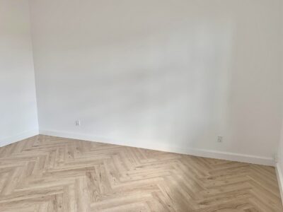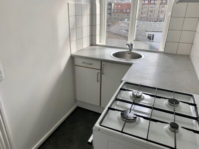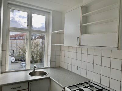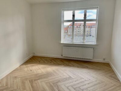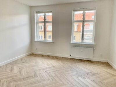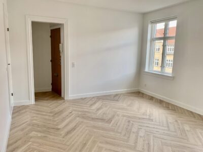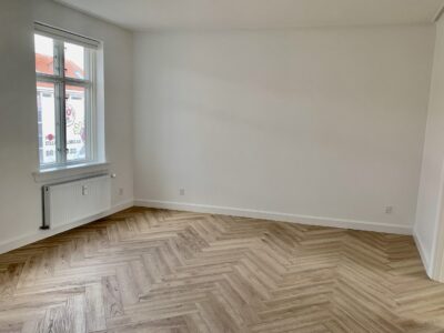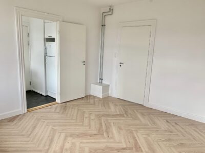Lejligheden er bestående af en lille entré, hvor der straks er indgang til stuen. Der er lagt et nyt flot sildebensgulv over alt i lejligheden, og det er så flot med lejlighedens vinduer, hvorfra lyset kommer ind og lyser det hele op.