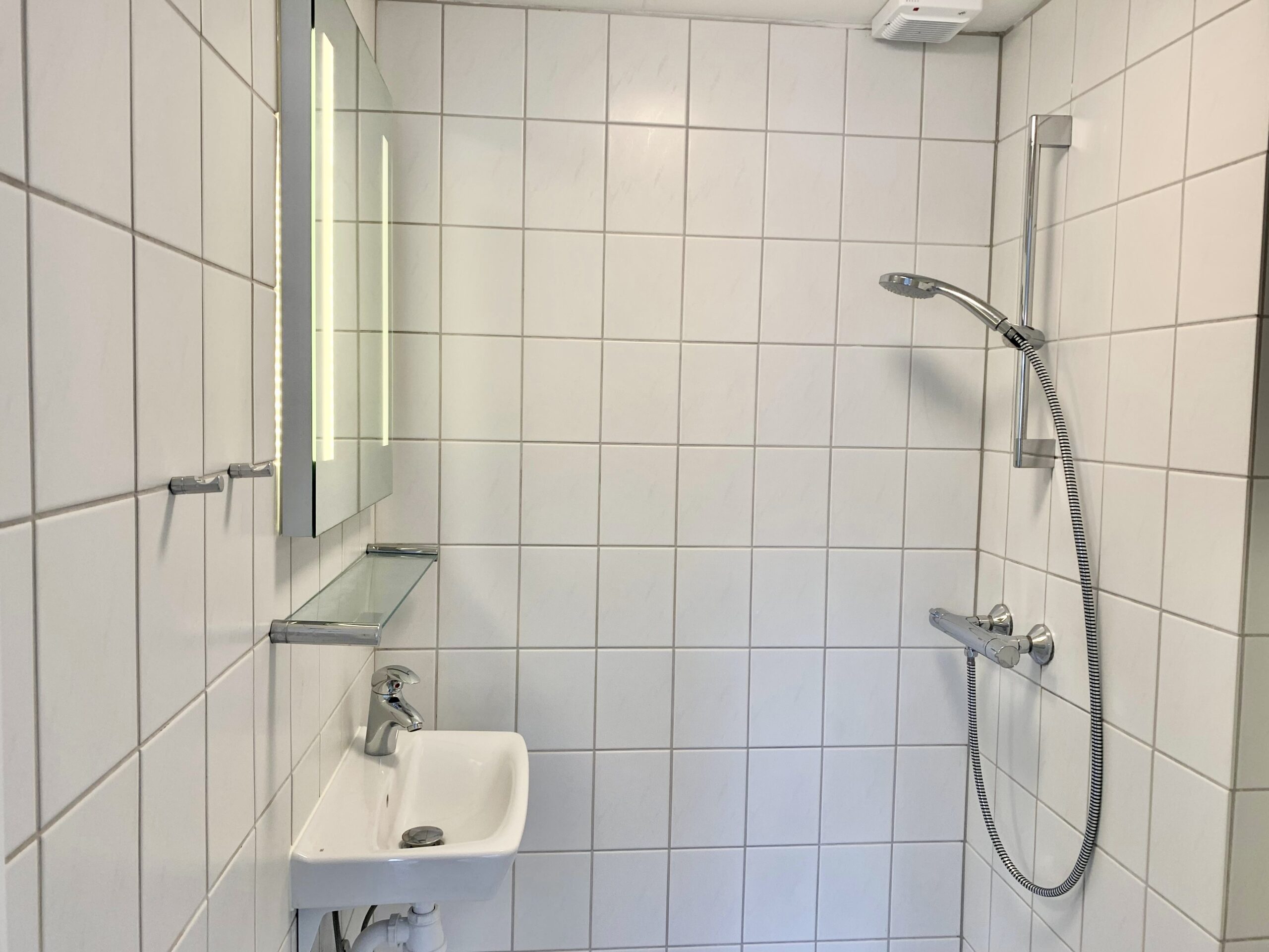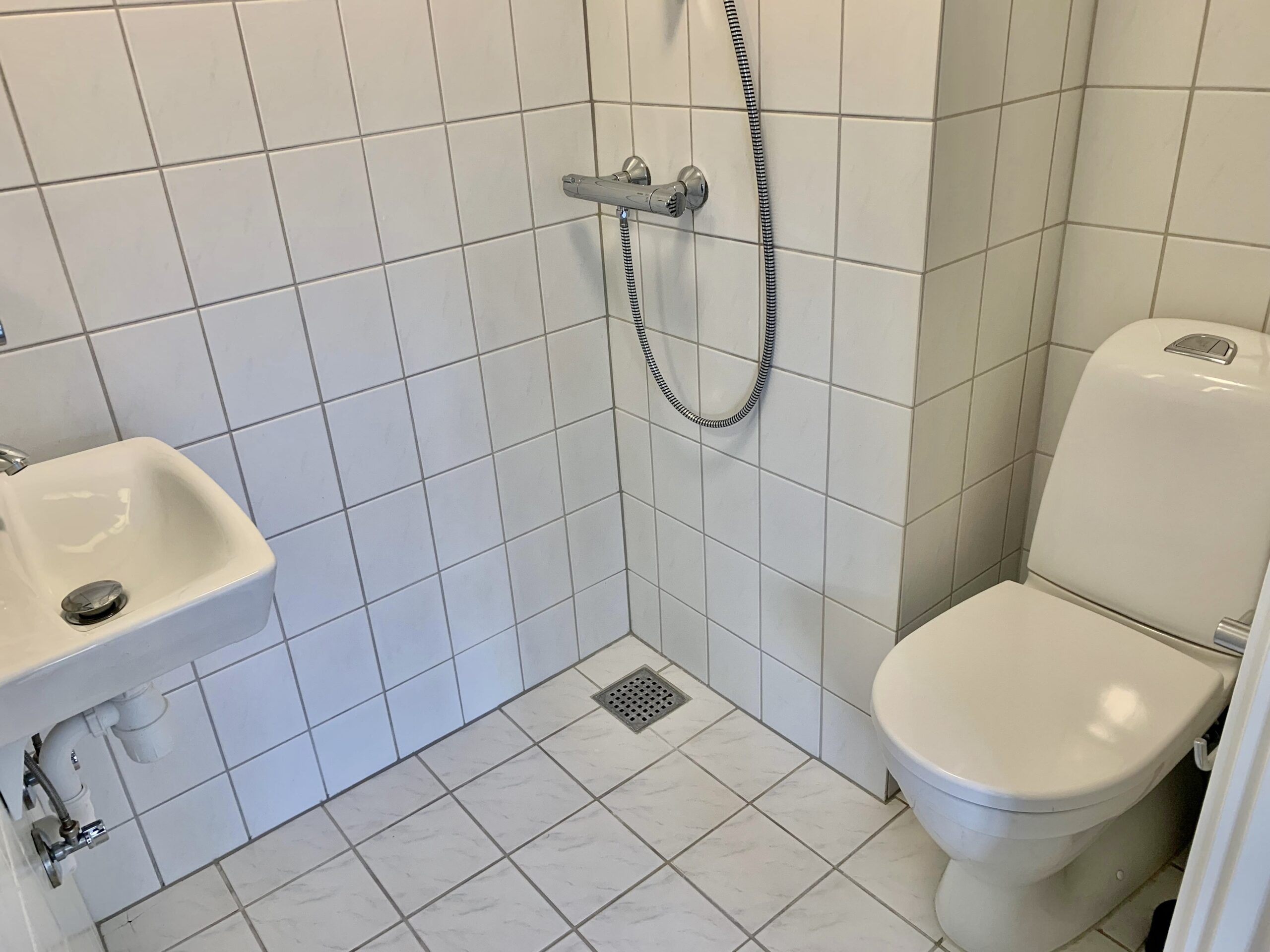 Badeværelset er flot hvidt og har en brusestang sat op, der adskiller bruseren fra resten.
