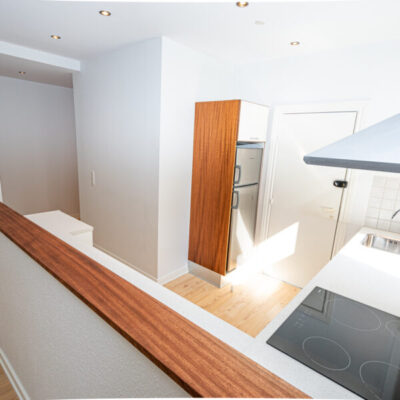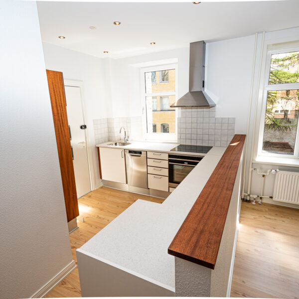 Lejligheden byder på en rummelig og indbydende entré med elegante spots i loftet, som skaber en varm velkomst. Herfra træder du direkte ind i det store og lyse køkken-alrum, som danner lejlighedens naturlige samlingspunkt. Køkkenet fremstår moderne og eksklusivt med hvide elementer med mahognikant, stålgreb, stålsokkel og alt i hårde hvidevarer – alle udført i rustfrit stål. Her får du både opvaskemaskine, kombineret vaskemaskine/tørretumbler, stort køle-/fryseskab, glaskeramisk kogeplade, indbygningsovn med varmluft og emhætte – samt stemningsfuld belysning fra spots i loft og under overskabene.
