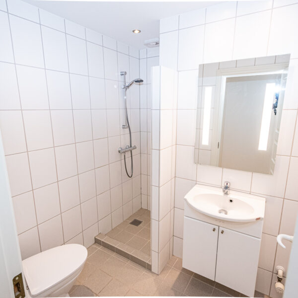 Badeværelset er lækkert og indbydende med moderne fliser, muret bruseniche, gulvvarme, skabsarrangement og spots i loftet – alt holdt i et stilrent og tidløst design.