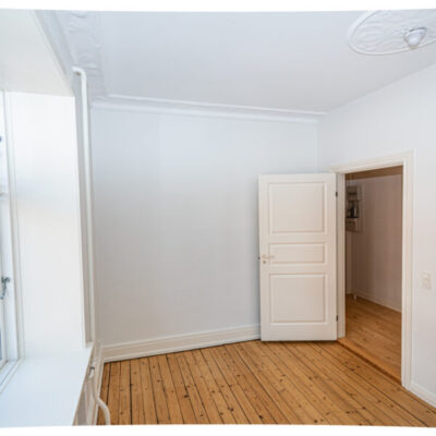 Lejligheden rummer desuden to store og lyse værelser, hvoraf det ene er smukt prydet med klassisk stukloft – en charmerende detalje, der tilføjer karakter og historie.