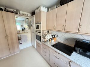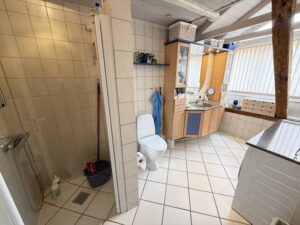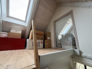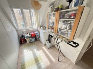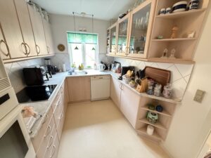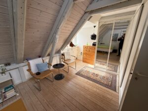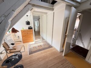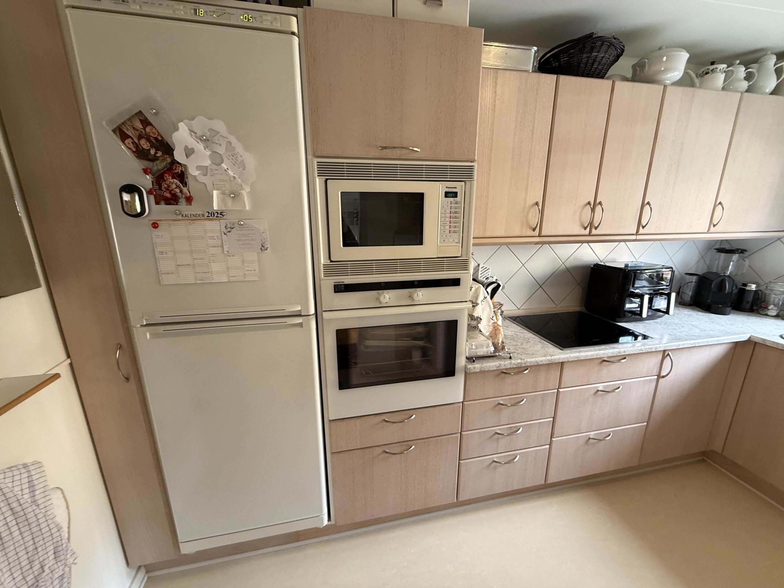 Lejligheden imponerer med et åbent køkken i lyse trænuancer og moderne faciliteter som opvaskemaskine og rummelig opbevaring. Stuen, med sine smukke trægulve og dusinvis af vinduer, fylder rummet med naturligt lys og skaber en hyggelig og indbydende atmosfære. Det perfekte sted til både afslapning og sammenkomster.