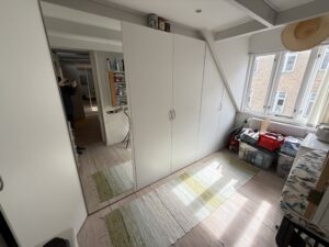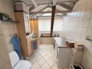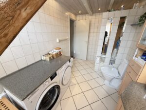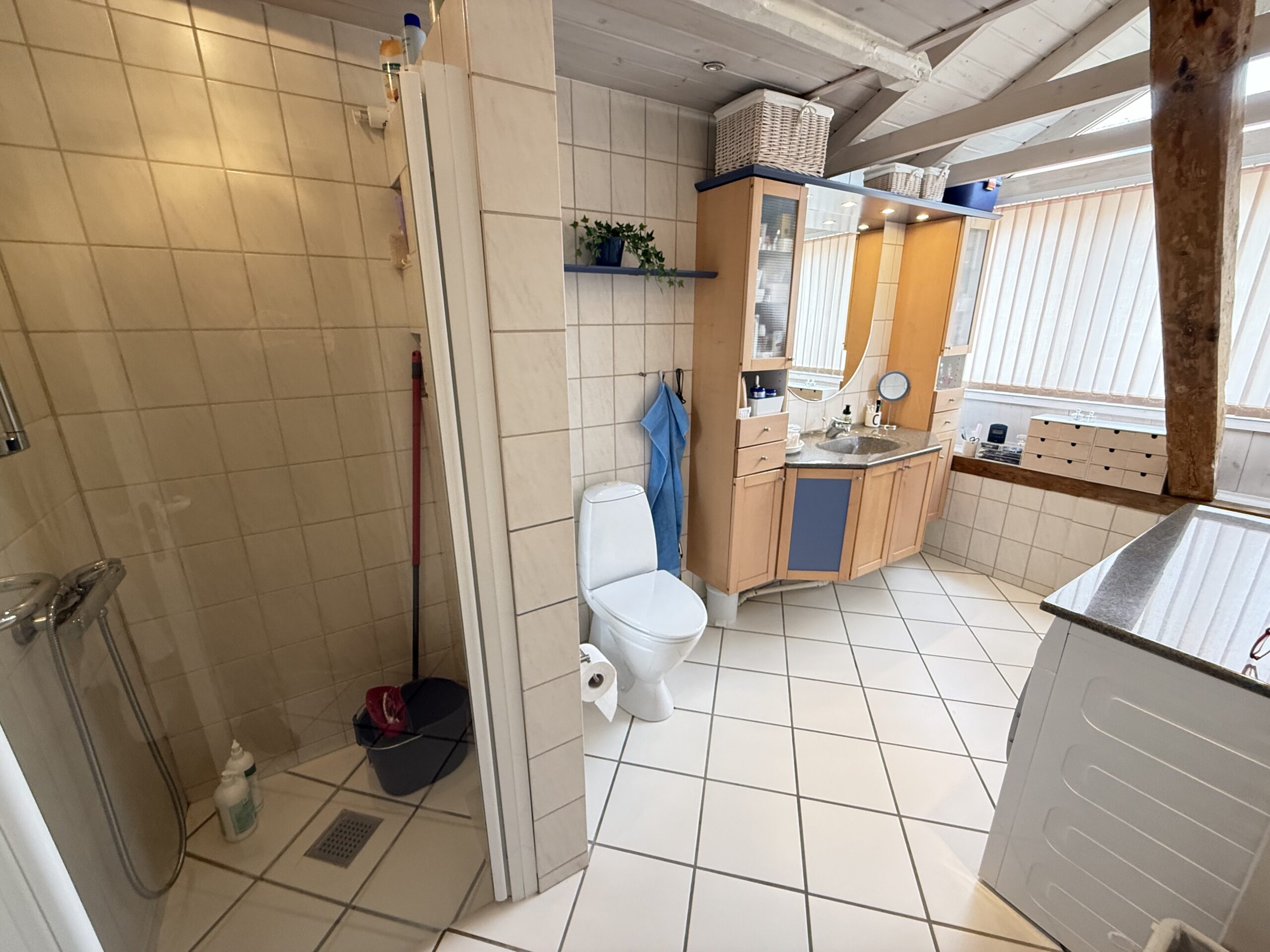 Hovedsoveværelset har et walk-in closet, der giver masser af plads til din garderobe. Badeværelset er både stilfuldt og funktionelt, med gulvvarme og moderne indretning. Her finder du også en praktisk vaskesøjle med vaskemaskine og tørretumbler. Som prikken over i’et har lejligheden en dejlig altan, perfekt til morgenkaffen.